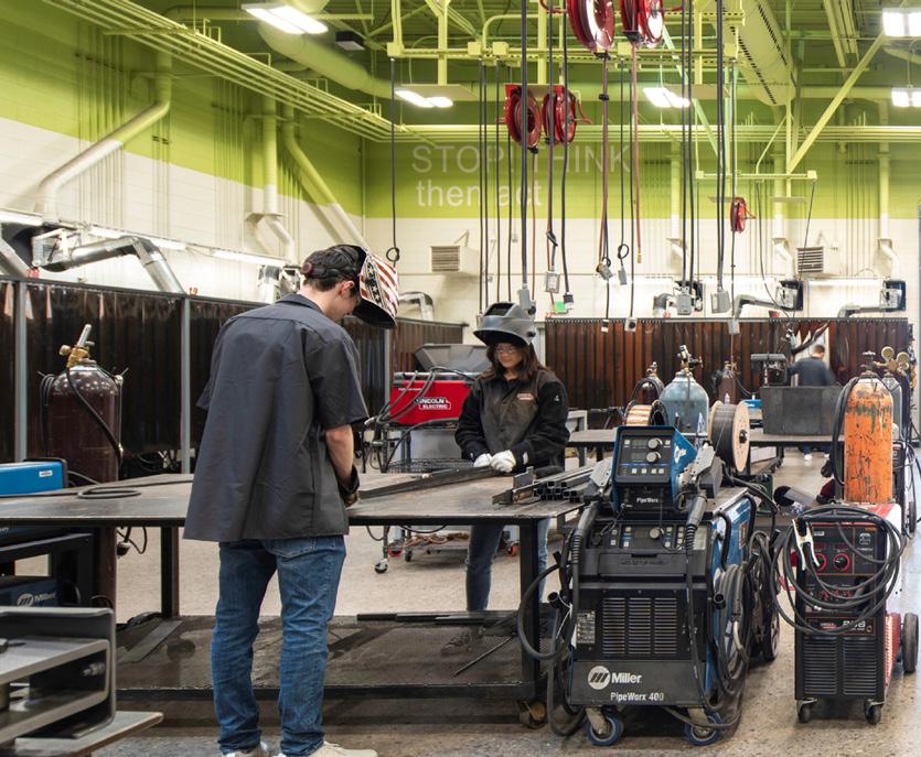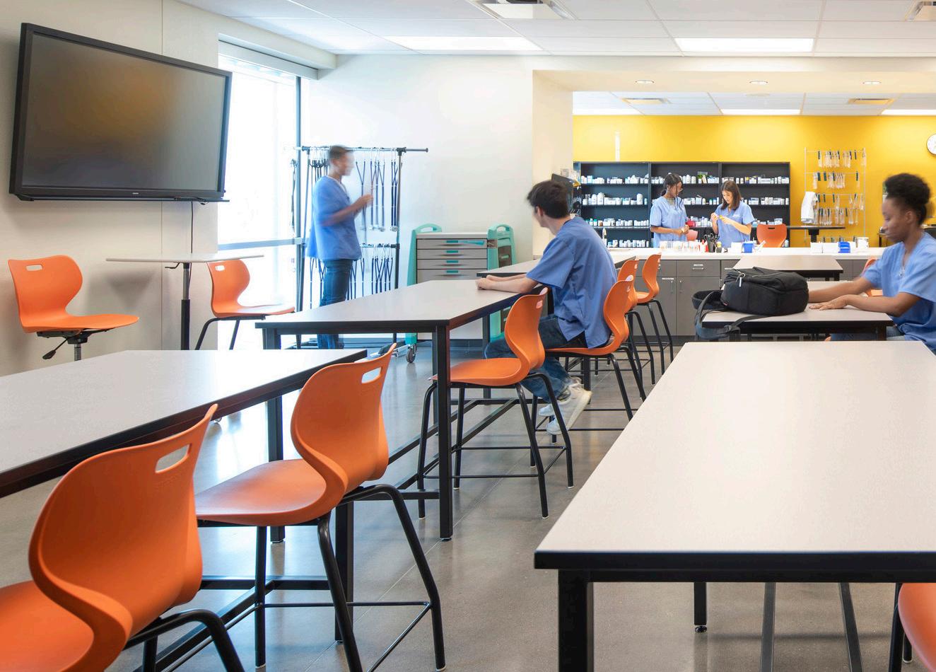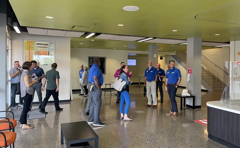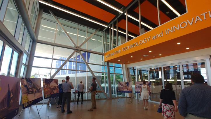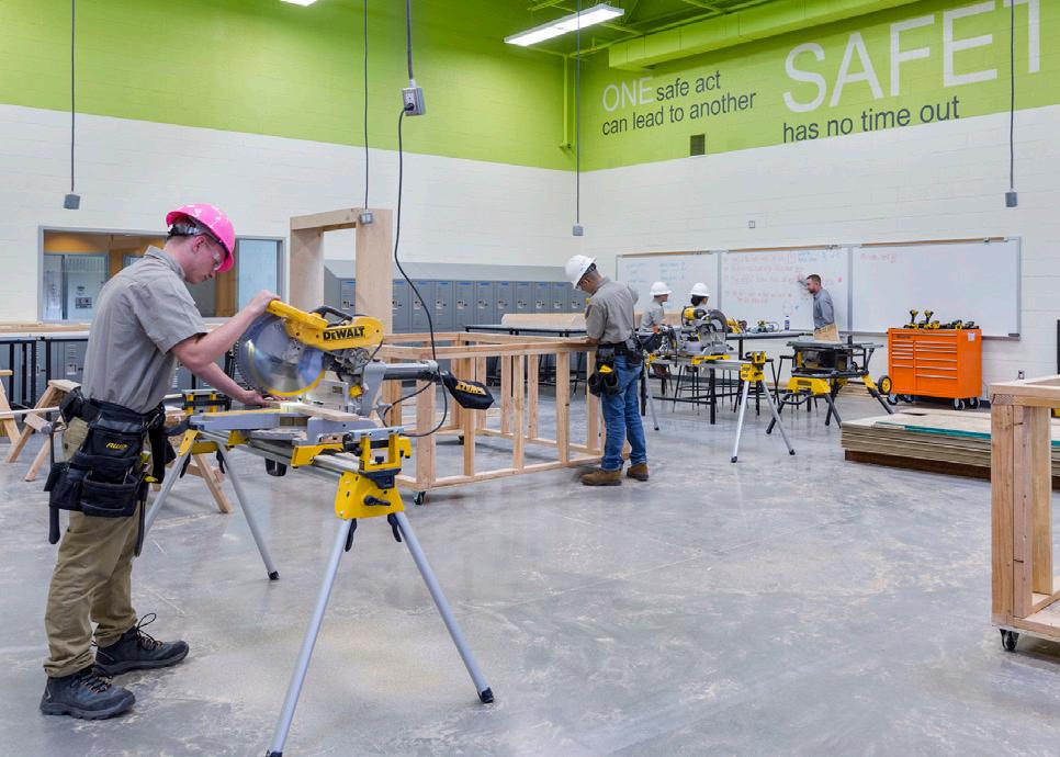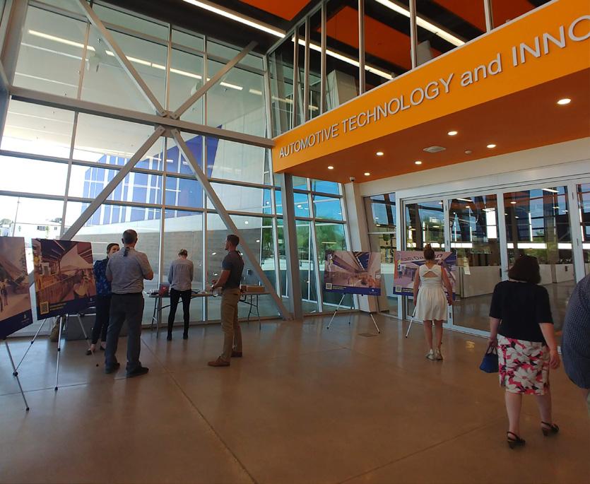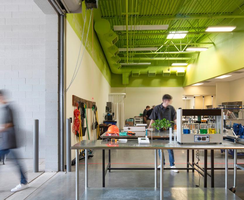 Continuing on the east side of the facility, the Auto program anchors the east wing with connections to adjacent learning spaces, various small group rooms for collaboration, and an auto gallery that allows partners to have a place to meet, display and highlight the innovation at the auto technology center. Heading towards the west side of the facility, construction Trades anchors the northwest space of the facility with adjacent classrooms for ease of access. Towards the southwest area of the facility lies the KAMSC program and law enforcement program. This location allows the KAMSC to have a separate entrance in the future if desired. KRESA is currently exploring options to house the KAMSC program at the new Kalamazoo CTE Center. At the time of printing this book, KRESA had not made final decisions regarding the inclusion of the KAMSC program. However, KRESA asked the Wightman/DLR Group design team to explore options to add the KAMSC program to the Kalamazoo CTE Center building.