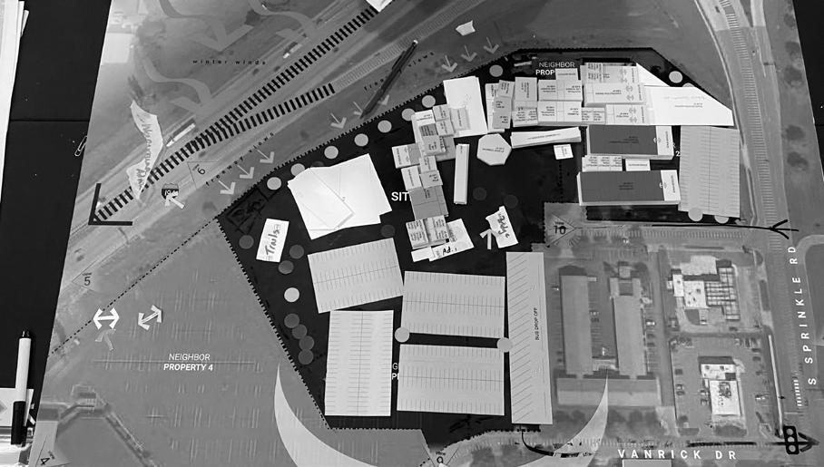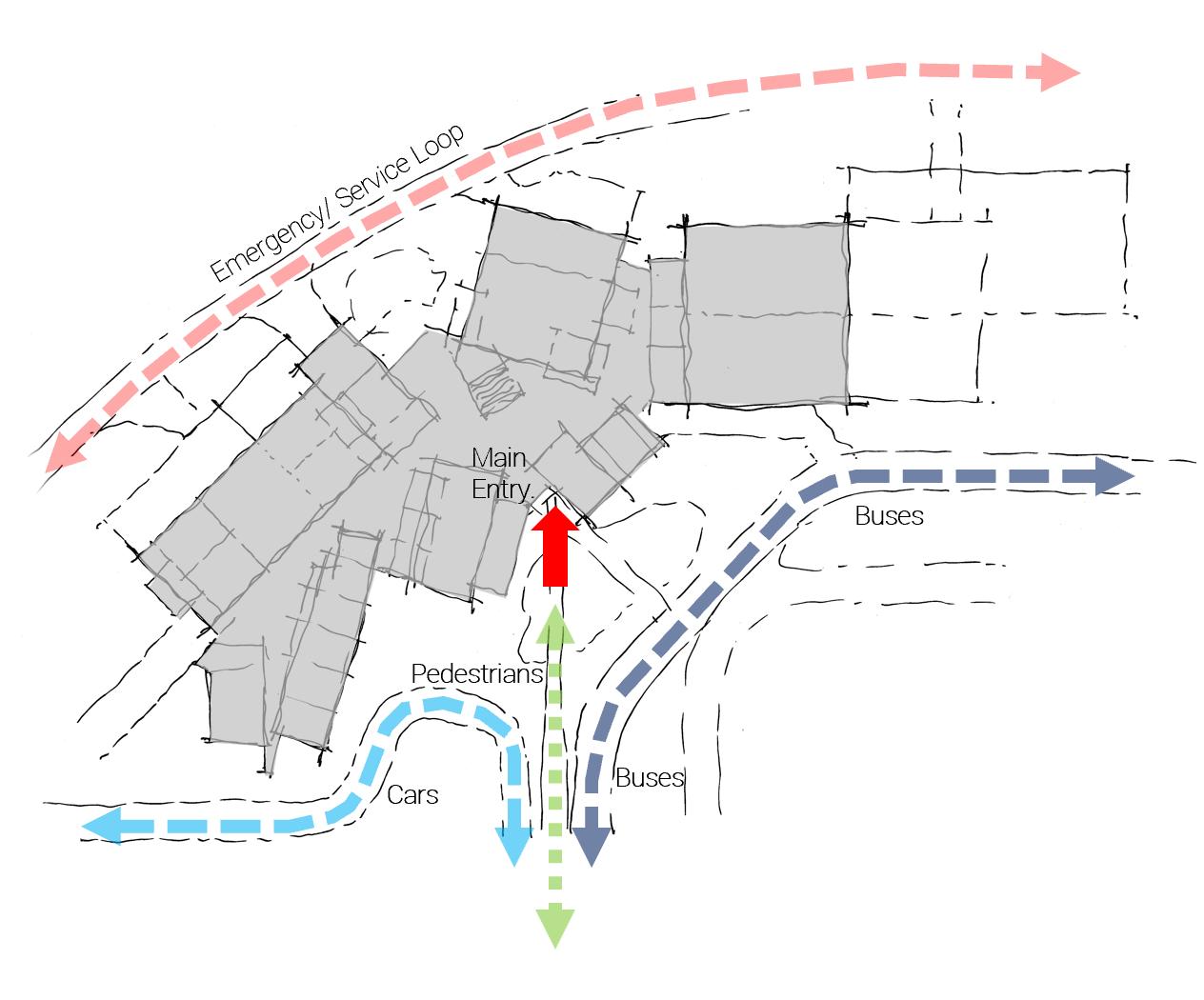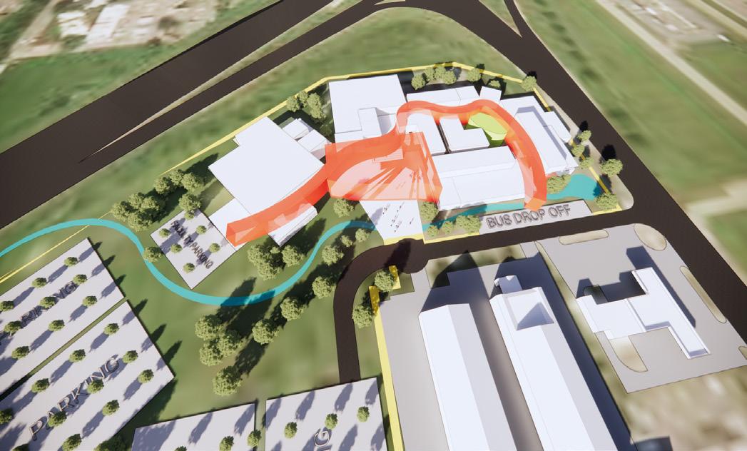 Overall, the distribution of the site consists of bus drop-off/bus parking on the southeast corner and a car drop-off area on the southwest corner of the property to connect with existing parking on the west. The conceptual arrangement of site vehicular traffic allows for the separation of cars and buses promoting a higher level of safety for pedestrians and the undisturbed operation of student and public transportation. In the car drop-off area, a plaza is developed to greet users of the facility into the main entry of the building.