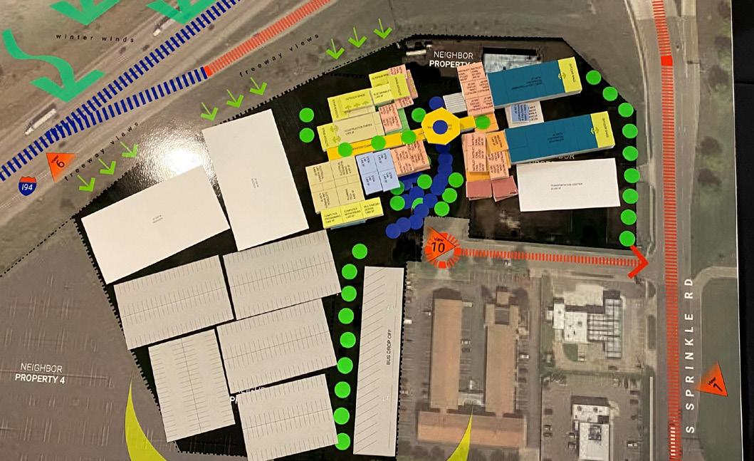 The building is placed centrally on the proposed site to allow for future expansion areas. The site concept is to continue the concept of Discovery Trail” by providing a bioswale/pond with a bridge on the entry of the facility to allow users of the facility to begin to experience the discovery trail.