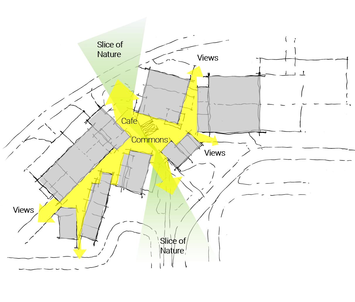 3. Major pathway lab spaces have their own massing and identity to break down the scale of the building, and an organic form flowing through commons connects everything together.