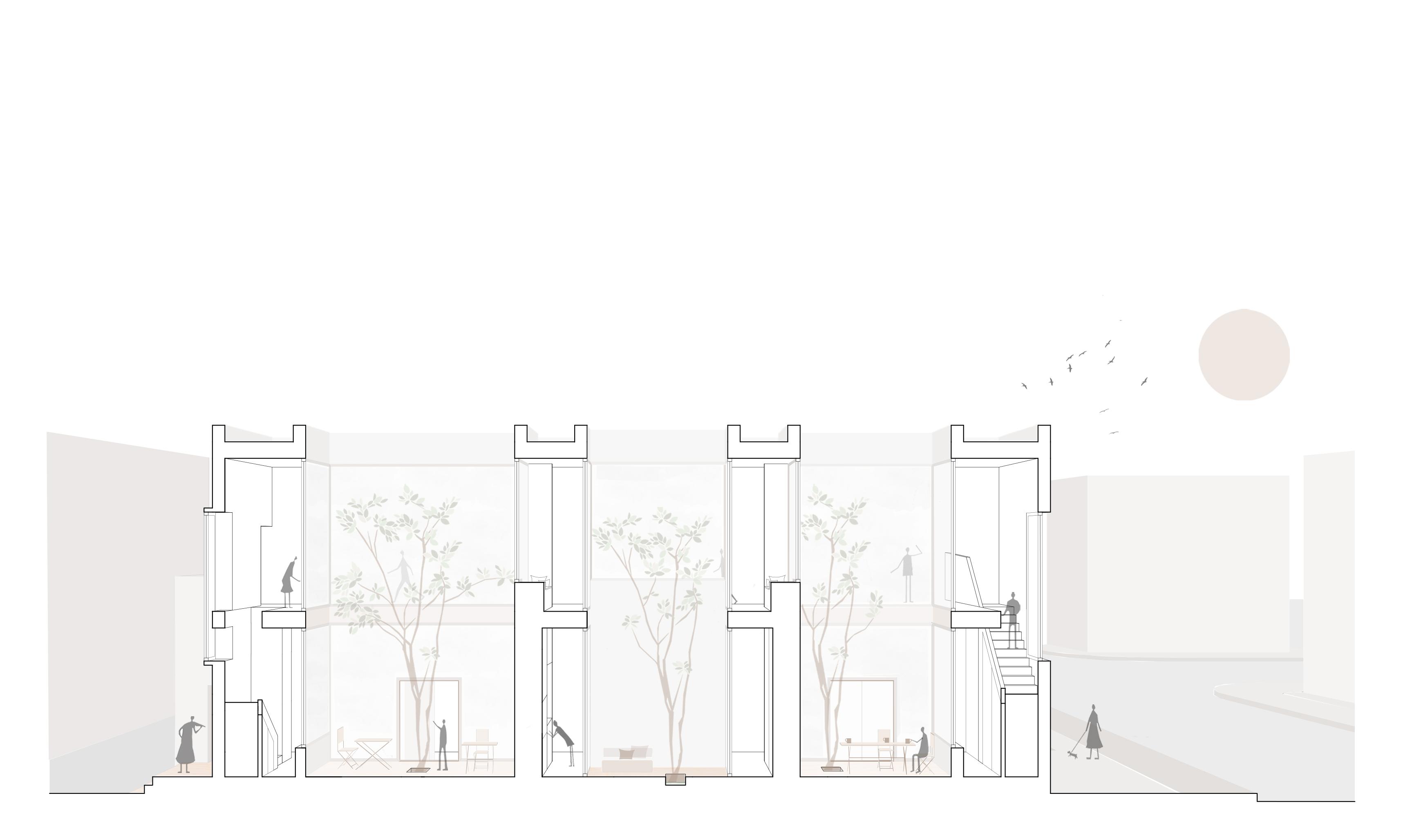 du rez-de-chaussée est situé en dessous du bloc des bureaux. Il est encadré de part et d’autre par l’espace extérieur interstitiel entre les 3 blocs, offrant ainsi un accès fluide vers l’extérieur. La transparence de l’enveloppe au niveau du rez-de-chaussée crée une relation entre la vue de la montagne, la végétation ainsi que la vue vers la ville. La connexion au bâtiment existant se fait du bloc de la bibliothèque, qui est adjacente à la faculté de musique actuelle. Le volume comprend des escaliers et une passerelle du côté sud, reliant le rez-dechaussée au deuxième étage de l’ancienne faculté. La lumière pénétrant cet espace est filtrée par une resille composée de lattes en aluminium verticales faisant toute la hauteur du bâtiment, qui se densifient et se dédensifient au niveau des escaliers. De plus, une deuxième connexion se fait au quatrième étage par un toit terrasse commun entre la bibliothèque et la terrasse existante de l’ancien bâtiment.