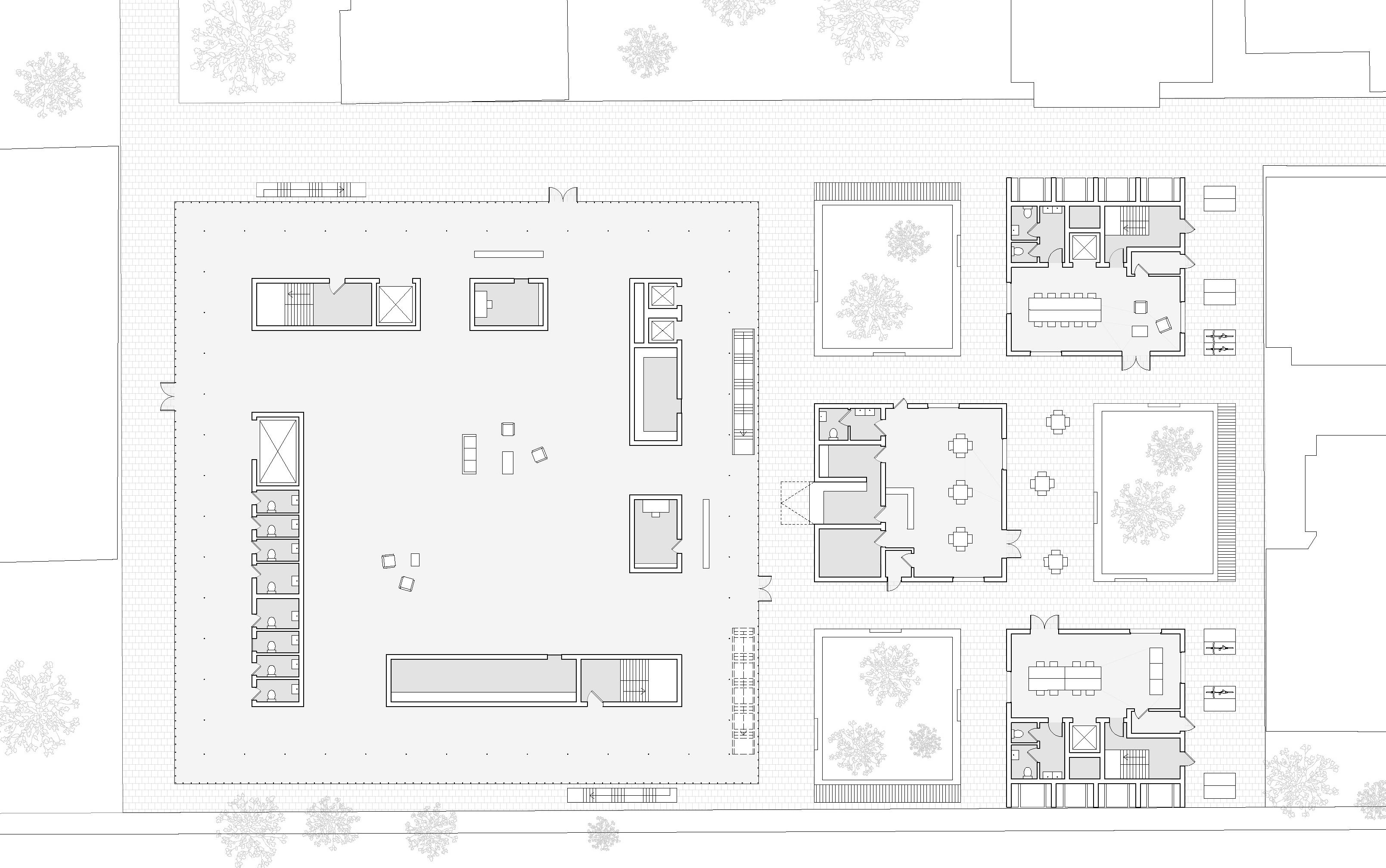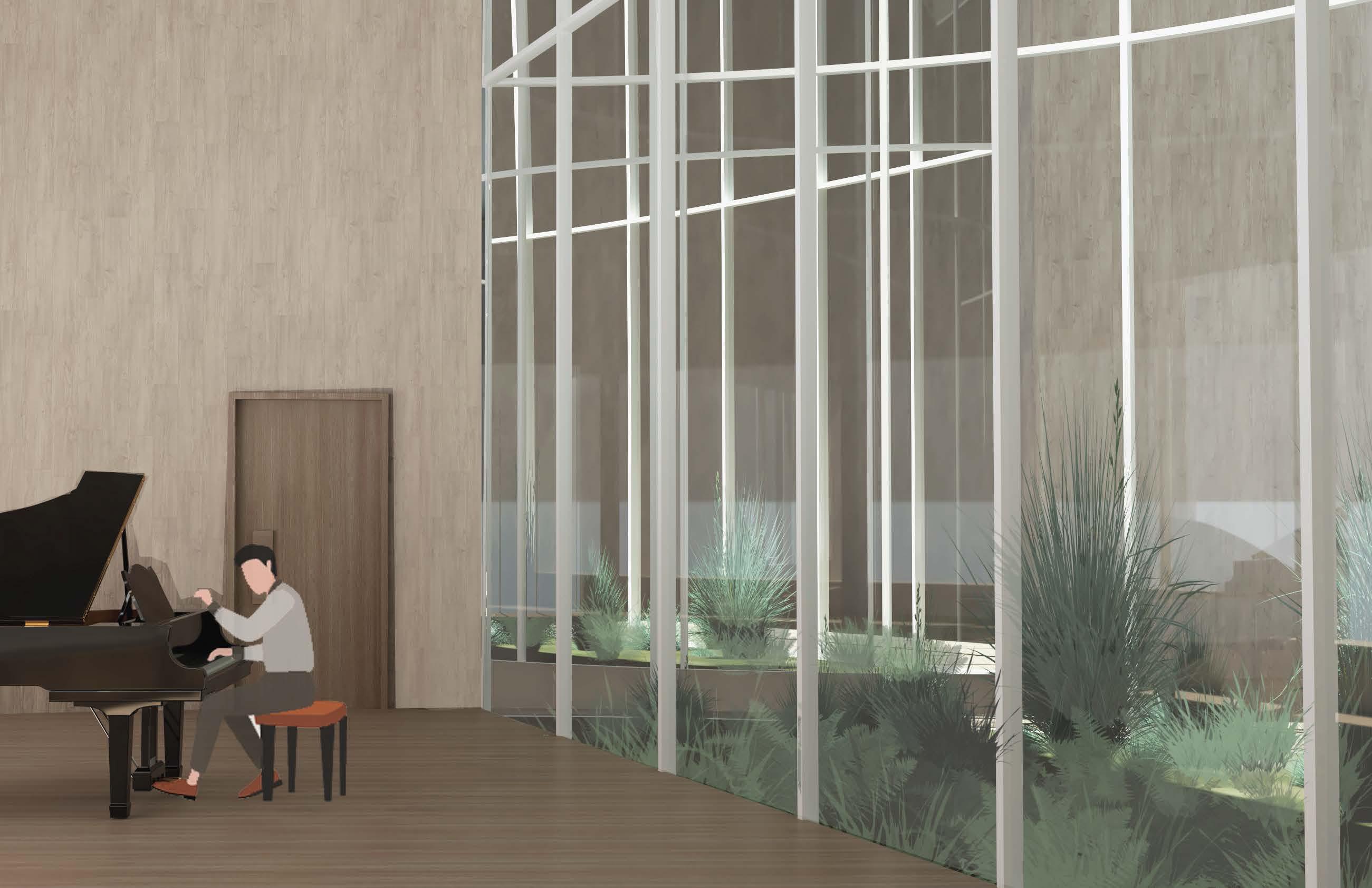 à la végétation d’infiltré le centre du volume. Ils font face aux studios de répétition, créant ainsi un espace stimulant pour la création et la production de la musique. Le toit de ce volume est végétalisé et accessible du deuxième étage de la bibliothèque et des bureaux. C’est un toit vert semi-extensif pour ses qualités énergétiques et sa faible lourdeur. Cependant, des zones intensives ont été implantée afin d’accueillir de plus grands arbres, servant de brise soleil et de brise vent au niveau de la terrasse.