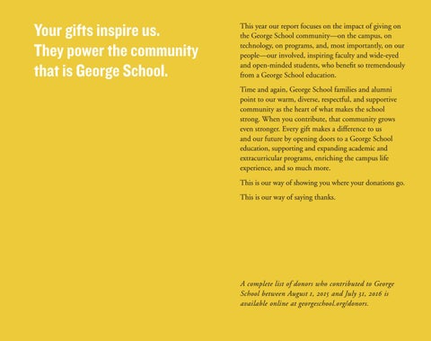 A complete list of donors who contributed to George School between August 1, 2015 and July 31, 2016 is available online at georgeschool.org/donors.