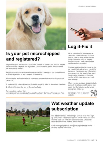 Log it-Fix it Is your pet microchipped and registered? Registering your pet ensures Council will be able to contact you, should they be lost and found. If a pet is not registered, Council has no option but to transfer the animal to a shelter. Registration requires a once-only payment which covers your pet for its lifetime in NSW, regardless of any changes in ownership. Microchipping and registration is a two-step process that requires dog and cat owners to: 1. Have the pet microchipped by 12 weeks of age by a vet or accredited implanter. 2. Lifetime Register the pet by 6 months of age. For more information, visit www.georgesriver.nsw.gov.au/Services/Regulatory-Services/Animals-and-Pets