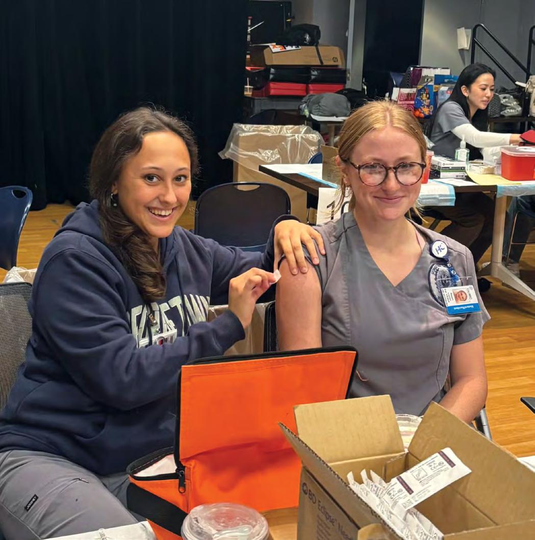 A student from the BSN program administering the flu vaccination to a fellow nursing student.