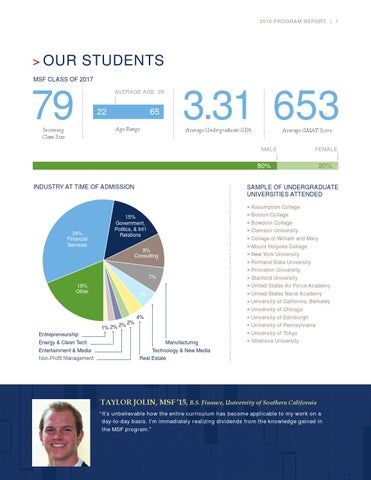 TAYLOR JOLIN, MSF ’15, B.S. Finance, University of Southern California “ It’s unbelievable how the entire curriculum has become applicable to my work on a day-to-day basis. I’m immediately realizing dividends from the knowledge gained in the MSF program.”
