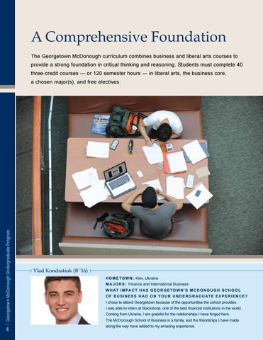 Vlad Kondratiuk (B ’16) H O M E T O W N : Kiev, Ukraine M A J O R S : Finance and International Business W H AT I M PA C T H A S G E O R G E T O W N ’ S M C D O N O U G H S C H O O L O F B U S I N E S S H A D O N Y O U R U N D E R G R A D U AT E E X P E R I E N C E ? I chose to attend Georgetown because of the opportunities the school provides. I was able to intern at Blackstone, one of the best financial institutions in the world. Coming from Ukraine, I am grateful for the relationships I have forged here. The McDonough School of Business is a family, and the friendships I have made along the way have added to my amazing experience.