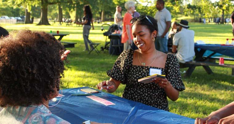 Bottom right: Valerie Coats plays spades with colleagues at the PJI alumni summer cookout.