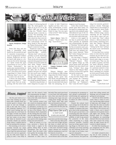 song at six minutes, guitarist/ producer Rostam Batmanglij samples M.I.A. and indulges in a long narrative about youthful, upper-class rebellion. While excellent songs, anyone clamoring for the simplicity of the band’s debut will prefer tracks like “Run”—which features a Mexican-influenced horn section, countering assertions that Vampire Weekend mines only Afro-pop—and “Giving Up the Gun,” perhaps the band’s most conventional modern rock song. It’s clear from even a cursory listen of Contra that the band’s members do not want to be pigeonholed. They can write twominute punk songs or six-minute electro-epics. They can rely on synths or guitars, and they can sound timelessly international or distinctly emblematic of a particular moment in time in New York City. As a result, there’s something for everyone on Contra, and it’s worth a listen, even for those that mocked their debut.