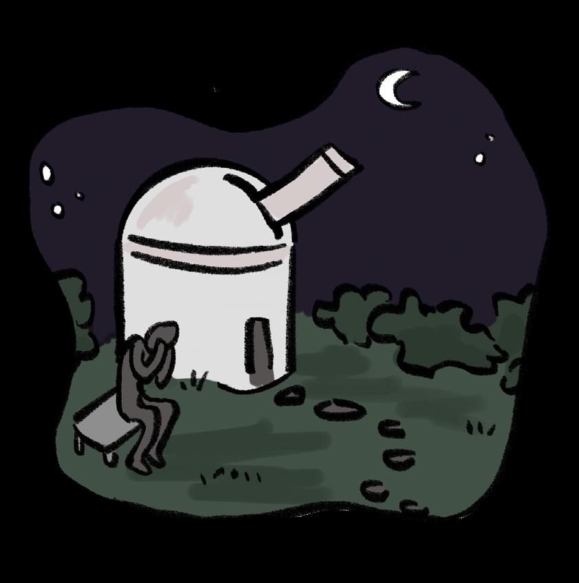 nothing compared to what you have been going through. The Observatory bench is where to go when all else fails—when your Yates workout was not stress-relieving enough and Mercury’s retrograde is sabotaging your love life. In this sanctuary, you can just stare into the forest and forget that you’ll have to walk all the way back to your room with your puffy, red face, trying to avoid all of the Yates lovers.