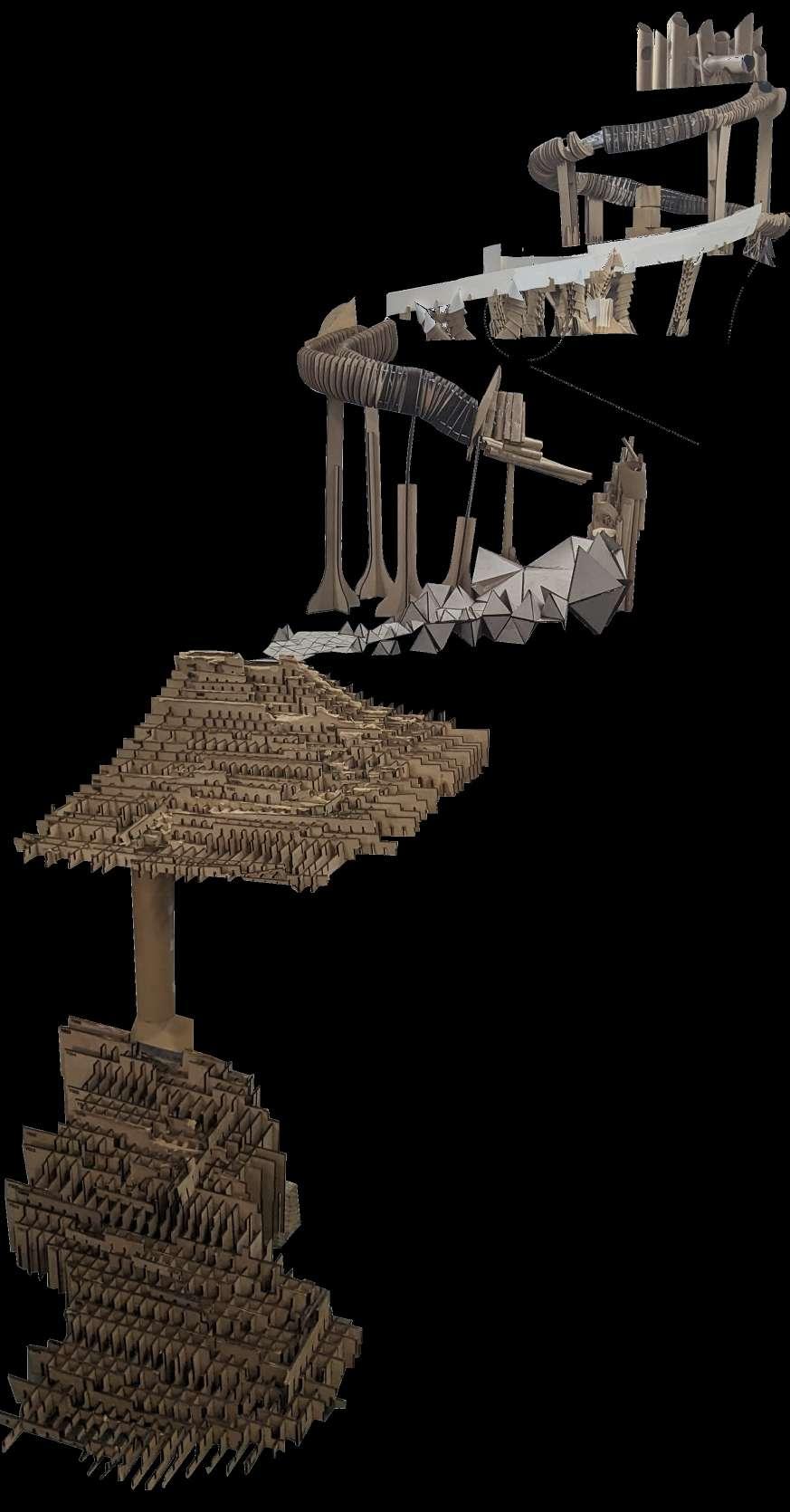 Within the concealed corners of KRVIA, secret spaces remain unknown even to the faculty. Here, a parallel world thrives, animated by the students’ initiative as they seek refuge from the ordinary. Monotony gives way to startling discoveries, transforming the school into a realm of exploration and the revelation of hidden gems. These spaces, designed for work, dining, rest, conversation, and relaxation, seamlessly integrate into the school. This network coexists alongside the institution, revealing itself to those who venture to find it. The drawing seeks to uncover this network that unites these concealed nooks throughout the school, both day and night.