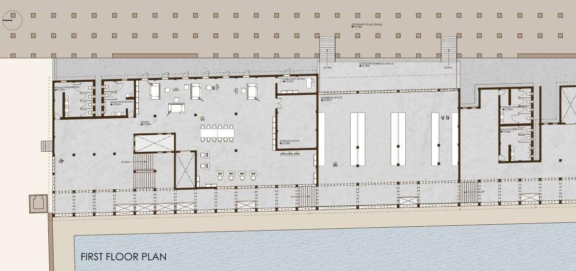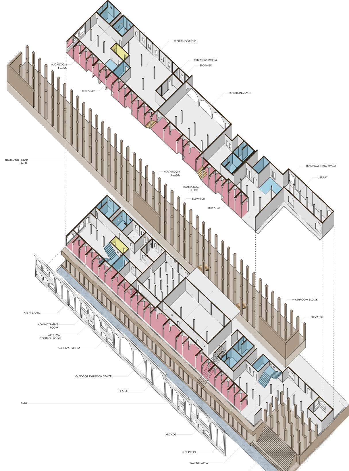 ‘Feedback Recording into an Acoustical Situation’ is explored through the means of an Archive which is built in conjunction of the Thousand Pillar Temple and the tank; with both being important part of the temple till date. The design tries to connect the two with space in between acting as an archive collecting and exhibiting scripts, drawings on the walls and roofs along with presenting older processionsal recordings and making them available to all.