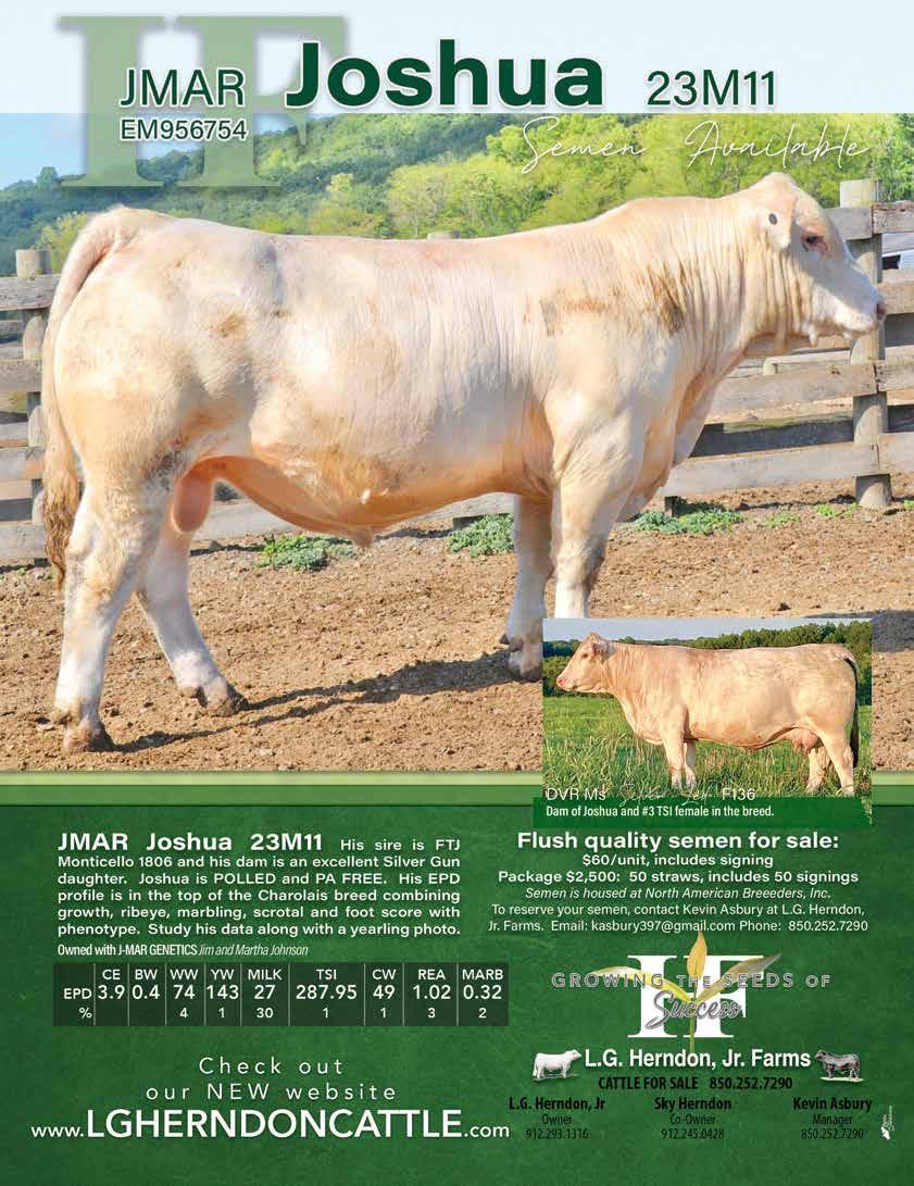 MARCH 2023 | GEORGIA CATTLEMAN 73 SEMEN SALES SERVING NORTH GEORGIA Wayne Ansley 1369 J. Warren Road Cornelia, GA 30531 706-499-3869 Randall Weiseman (850) 492-7196 EQUIPMENT Joey Roberts 706-318-8848 Bowman, GA 30624 www.rockinrtrailers.com “Quality Sales and Service Since 1980” (912) 632-7240 • 1-888-632-7337 H & H EQUIPMENT SALES, INC. MENSCH MFG MENSCH MFG TIM HARPER Email: hhequip@accessatc.net Cell: 912-375-1351 P.O. BOX 468 ALMA, GEORGIA 31510 ADVANCED POWER EQUIPMENT 17 SILVER LANE ZEBULON, GA 30295 JERRY WALLACE 770-567-0099 WWW.ADVANCEDPOWEREQUIPMENT.COM chris@tysonsteel.com tysonsteelbuilding.com Working and Penning Cattle Ultrasounding -1st, 2nd and 3rd Trimester Cows 229-392-2424 | Tifton, GA Busbin Cattle Works LIVESTOCK SERVICES Bryan T. Oglesby, CFP® Managing Director Financial Advisor RJFS www.wealthintel.com Locations: 9840 Hwy 19 North P.O.Box 352 Zebulon, GA 30295 (470)745-5030 1000 Broadway P.O.Box 2586 Columbus, GA 31901 (706)571-2100 Securities offered through Raymond James Financial Services, Inc. Member FINRA/SIPC Wealth Intelligence is not a Broker/Dealer PROFESSIONAL SERVICES Farm Insurance Bill Hembree o: 770-942-3366 | c: 678-761-5757 hembrew@nationwide.com > edwardjones.com | Member SIPC MKT-5894L-A-A1 AECSPAD Receiving proceeds from selling your farm? Nancy P Demirtas, AAMS™ Financial Advisor 6488 Spring Street Suite 201 Douglasville, GA 30134-5615 770-942-9442 Jude Sherlock Barn Painting, Roof Painting, Fences & More! IF IT”S OUTSIDE, WE CAN PAINT IT! • 35 years experience • Work is guaranteed • Certified and insured painters •Airless spray equipment Contact Jude: Cell: 803-439-6484 • Office: 800-996-2320