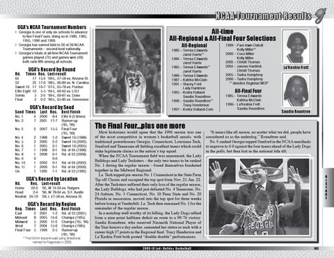 Most historians would agree that the 1996 season was one of the most competitive in women’s basketball annals, with traditional powerhouses Georgia, Connecticut, Louisiana Tech, Stanford and Tennessee all fielding excellent teams which could stake legitimate claims as the nation’s top squad. When the NCAA Tournament field was announced, the Lady Bulldogs and Lady Techsters – the only two teams to be ranked No. 1 during the regular season – found themselves bracketed together in the Midwest Regional. La. Tech topped pre-season No. 1 Connecticut in the State Farm Tip-off Classic and occupied the top spot from Nov. 21-Jan. 22. After the Techsters suffered their only loss of the regular season, the Lady Bulldogs, who had just defeated No. 4 Tennessee, No. 24 Auburn, No. 3 Connecticut, No. 10 Penn State and No. 20 Florida in succession, moved into the top spot for three weeks before losing at Vanderbilt. La. Tech then remained No. 1 for the remainder of the regular season. In a matchup well worthy of its billing, the Lady Dogs rallied from a nine-point halftime deficit en route to a 90-76 victory. Saudia Roundtree, who received Naismith National Player of the Year honors a day earlier, cemented her status as such with a career-high 37 points in the Regional final. Tracy Henderson and La’Keshia Frett both posted “double-double” performances. 2009-10 Lad y Bulldo G Basketball