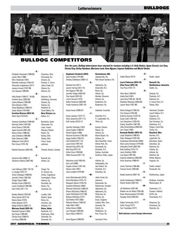 Bulldog Competitors Over the years, Bulldog letterwinners have returned for reunions including (r-l): Kelly Baskin, Agata Cioroch, Lori Grey, Christa Grey, Kelley Hyndman, Marianna Land, Anne Nguyen, Evgenia Subbotina and Mariel Verban -AElizabeth Alexander (1988-89) Laurie Allen (1980) Ellen Alsobrook (1981) Michelle Anderson (1994-97) Alexandra Anghelescu (2011) Jessica Annest (1997-98) Lisa Apanay (1986-89) -BKelly Baskin (1996-97, ’99-00) Caroline Basu (2005-06) Lianna Bebeau (1985-88) Chris Belasco (1981) Tonya Bogdonas (1989-92) Susan Boyett (1979-80) Caroline Brinson (2014-16) Sherri Byrd (1979-81) -CVanessa Castellano (1998-99) Marissa Catlin (1997-00) Anne Chauzu (1993-96) Agata Cioroch (2001-04) Nancy Cohen (1980-82) Jane Cohodes (1985-88) Kelly Coleman (1986) Makenzie Craft (2013) Pam Crews (1975-76) -DMonika Dancevic (2007-09)