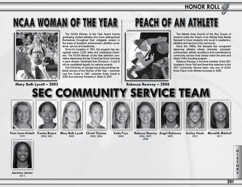 PEACH OF AN ATHLETE The Atlanta Area Council of the Boy Scouts of America holds the Peach of an Athlete Role Model Banquet to honor students who excel in academics, athletics and service to the community. Since the 1980s, the banquet has recognized deserving athletes whose character, scholastic achievement, athletic excellence and commitment to community service most closely match the aims and ideals of the Scouting program. Rebecca Rowsey, a five-time member of the SEC Academic Honor Roll and three-time selection to the SEC Community Service team, was one of UGA’s three Peach of an Athlete honorees in 2008.