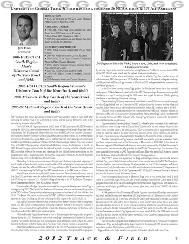 COACHING EXPERIENCE • 1988, Head Coach, Gainesville (Fla.) High School • 1989-90, Assistant Men’s Coach, Florida • 1990-2000, Head Cross Country/Assistant Track & Field Coach, Missouri • 1999, Men’s Assistant Coach, United States Pan-American Games • 2000-02, Head Coach, Illinois State • 2002-08, H ead C ross C ountry C oach , Florida • 2008-Present, Assistant Coach, Georgia