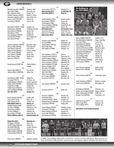 -- D -Monika Dancevic (2007--09) Thorold, Ontario, Canada -- E -Cameron Ellis (2008--11) Roswell, Ga. Adrienne Elsberry (2007-08) Athens, Ga. -- F -Lara Fakhoury (2007, ’09-10) Lu Fendig (1976-77) Amila Fetahagic (1988-89) Jennifer Fisher (1982-83) Wright Floyd (1988) Natalie Frazier (2004-07) Laurie Friedland (1985-88) Kate Fuller (2011)