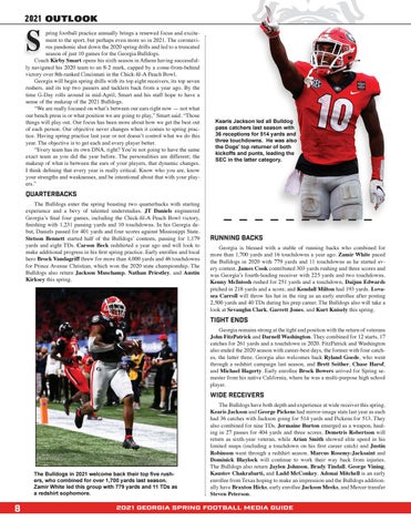 2021 outlook pring football practice annually brings a renewed focus and excitement to the sport, but perhaps even more so in 2021. The coronavirus pandemic shut down the 2020 spring drills and led to a truncated season of just 10 games for the Georgia Bulldogs. Coach Kirby Smart opens his sixth season in Athens having successfully navigated his 2020 team to an 8-2 mark, capped by a come-from-behind victory over 8th-ranked Cincinnati in the Chick-fil-A Peach Bowl. Georgia will begin spring drills with its top eight receivers, its top seven rushers, and its top two passers and tacklers back from a year ago. By the time G-Day rolls around in mid-April, Smart and his staff hope to have a sense of the makeup of the 2021 Bulldogs. “We are really focused on what’s between our ears right now — not what our bench press is or what position we are going to play,” Smart said. “Those things will play out. Our focus has been more about how we get the best out of each person. Our objective never changes when it comes to spring practice. Having spring practice last year or not doesn’t control what we do this year. The objective is to get each and every player better. “Every team has its own DNA, right? You’re not going to have the same exact team as you did the year before. The personalities are different; the makeup of what is between the ears of your players, that dynamic changes. I think defining that every year is really critical. Know who you are, know your strengths and weaknesses, and be intentional about that with your players.”