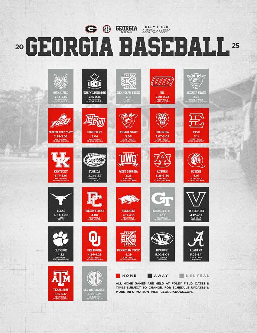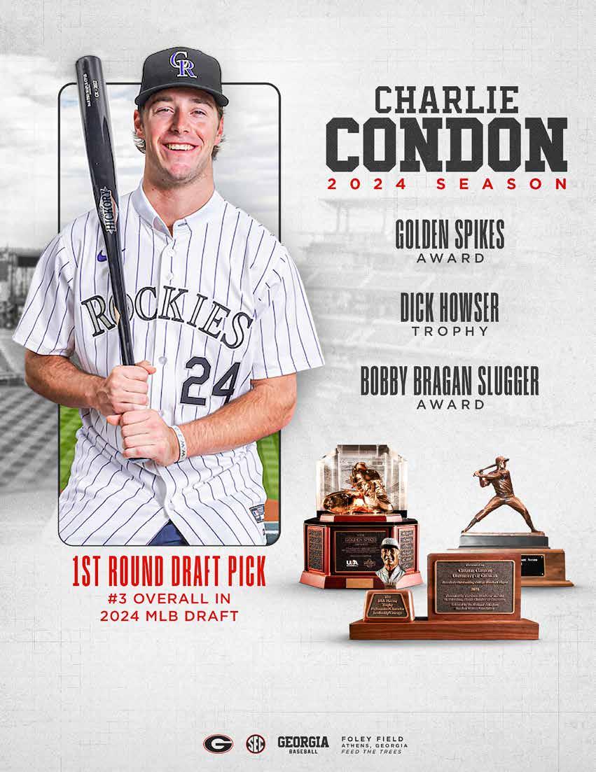 Inside Front: Charlie Goldstein, Zach Harris, Brian Zeldin, Brian Curley, Collin Caldwell and Alton Davis III. Inside Back: Charlie Condon sweeps the national awards. Back Cover: The 2025 Georgia schedule. Credits: The 2025 University of Georgia baseball media guide was produced by the Georgia Sports Communications Office. Editors: Christopher Lakos and Julia Maenius along with Elizabeth Isakson, Maya McKenzie, Kaylin Vidal and Mollie Lanigan. Thanks to Will Whitty/UGA Creative Services for the cover design. Contributing Photographers: Tony Walsh, Conor Dillon, Kari Hodges, Rob Davis, Cassie Baker, Kayla Renie, Mackenzie Miles, Chamberlain Smith, Seattle Mariners/Ben VanHouten, Kristin Bradshaw, Lauren Tolbert, Steffenie Burns, Caitlyn Tam, Cory A. Cole, David Barnes, Emily Selby, John Paul Van Wert, Sean Taylor, John Kelley, Steven Colquitt, Cassie Wright Photography, Michael Wade, Ted Mayer, Parker Moore, Pouya Dianat, Kelly Wegel, Julianne Upchurch, Radi Nabulsi, Phillip Faulkner, Prairie Pixel Group, Dan Evans, Z&N Sports, Philip Williams, Scott Bruhn, Perry McIntyre, Paul Efland, Ric O’Quinn, Terry Allen, Chris Collins, Larry Goren, Dot Paul, Jim Matthews, Paul Sancya, Tony Dejak, Wesley Hitt, Winslow Townson, Ted Kirk, Mike Strasinger, Julie Jacobson, Serge Maijer, Alyson Boyer Rode, Cameron Harris, Brent Ingram and Eric Doennig with USA Baseball, Getty Images, Colorado Rockies and MLB Photography.