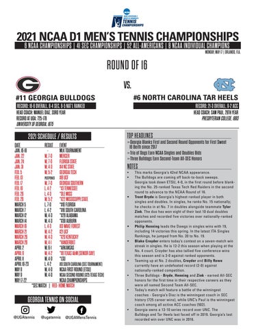 This marks Georgia’s 42nd NCAA appearance. The Bulldogs are coming off back-to-back sweeps. Georgia took down ETSU, 4-0, in the first round before blanking the No. 25-ranked Texas Tech Red Raiders in the second round to advance to the NCAA Round of 16. Trent Bryde is Georgia’s highest-ranked player in both singles and doubles. In singles, he ranks No. 15 nationally; he checks in at No. 7 in doubles alongside teammate Tyler Zink. The duo has won eight of their last 10 dual doubles matches and recorded five victories over nationally-ranked opponents. Philip Henning leads the Dawgs in singles wins with 19, including 14 victories this spring. In the latest ITA Singles Rankings, he jumped from No. 20 to No. 19. Blake Croyder enters today’s contest on a seven-match win streak in singles. He is 12-2 this season when playing at the No. 4 court. Croyder has also tallied five conference wins this season and is 3-0 against ranked opponents. Teaming up at No. 2 doubles, Croyder and Billy Rowe currently have an undefeated record (2-0) against nationally-ranked competition. Three Bulldogs - Bryde, Henning and Zink - earned All-SEC honors for the first time in their respective careers as they were all named Second Team All-SEC. Today’s match will feature a battle of the winningest coaches - Georgia’s Diaz is the winningest coach in SEC history (725 career wins), while UNC’s Paul is the winningest coach among all active ACC coaches (502). Georgia owns a 13-10 series record over UNC. The Bulldogs and Tar Heels last faced off in 2019. Georgia’s last recorded win over UNC was in 2016.
