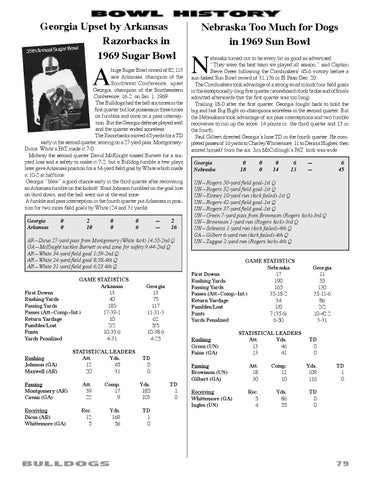 huge Sugar Bowl crowd of 82,113 saw Arkansas, champion of the Southwest Conference, upset Georgia, champion of the Southeastern Conference, 16-2, on Jan. 1, 1969. The Bulldogs had the ball six times in the first quarter but lost possession three times on fumbles and once on a pass interception. But the Georgia defense played well and the quarter ended scoreless. The Razorbacks moved 65 yards for a TD early in the second quarter, scoring on a 27-yard pass, MontgomeryDicus. White’s PAT made it 7-0. Midway the second quarter David McKnight tossed Burnett for a sixyard loss and a safety to make it 7-2, but a Bulldog fumble a few plays later gave Arkansas position for a 34-yard field goal by White which made it 10-2 at halftime. Georgia ‘‘blew’’ a good chance early in the third quarter after recovering an Arkansas fumble on the kickoff. Brad Johnson fumbled on the goal line on third down, and the ball went out of the end zone. A fumble and pass interception in the fourth quarter put Arkansas in position for two more field goals by White (24 and 31 yards). Georgia 0 Arkansas 0