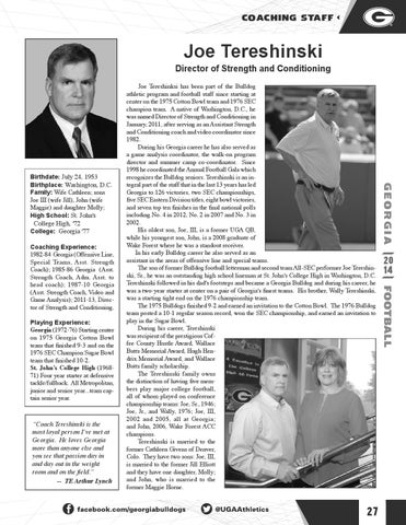 College: Georgia '77 Coaching Experience: 1982-84 Georgia (Offensive Line, Special Teams, Asst. Strength Coach); 1985-86 Georgia (Asst. Strength Coach, Adm. Asst. to head coach); 1987-10 Georgia (Asst. Strength Coach, Video and Game Analysis); 2011-13, Director of Strength and Conditioning. Playing Experience: Georgia (1972-76) Starting center on 1975 Georgia Cotton Bowl team that finished 9-3 and on the 1976 SEC Champion Sugar Bowl team that finished 10-2. St. John’s College High (196871) Four year starter at defensive tackle/fullback. All Metropolitan, junior and senior year...team captain senior year.