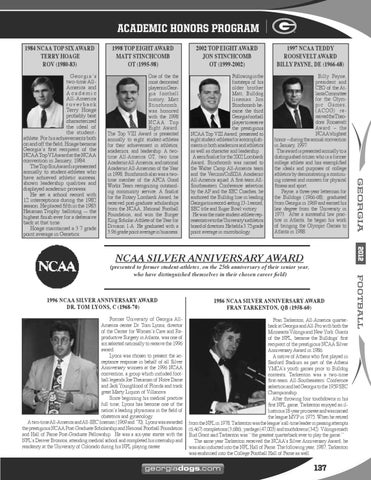 One of the the most decorated players in Georgia football history, Matt Stinchcomb, was honored with the 1998 N C A A To p Eight Award. The Top VIII Award is presented annually to eight student-athletes for their achievement in athletics, academics, and leadership. A twotime All-America OT, two time Academic All-America, and national Academic All-American of the Year in 1998, Stinchcomb also was a twotime member of the AFCA Good Works Team recognizing outstanding community service. A finalist for the Rotary Lombardi Award, he received post-graduate scholarships from the NCAA, National Football Foundation, and won the Burger King Scholar-Athlete of the Year for Division 1-A. He graduated with a 3.96 grade point average in business.