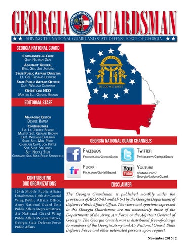 Disclaimer The Georgia Guardsman is published monthly under the provisions of AR 360-81 and AF 6-1 by the Georgia Department of Defense Public Affairs Office. The views and opinions expressed in the Georgia Guardsman are not necessarily those of the Departments of the Army, Air Force or the Adjutant General of Georgia. The Georgia Guardsman is distributed free-of-charge to members of the Georgia Army and Air National Guard, State Defense Force and other interested persons upon request. November 2015 | 2