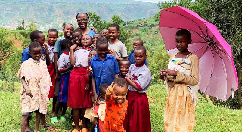 Dr. Margie Gill (at back, center) visits with Rwandan students of Crimson Academy, of which she is a co-founder.