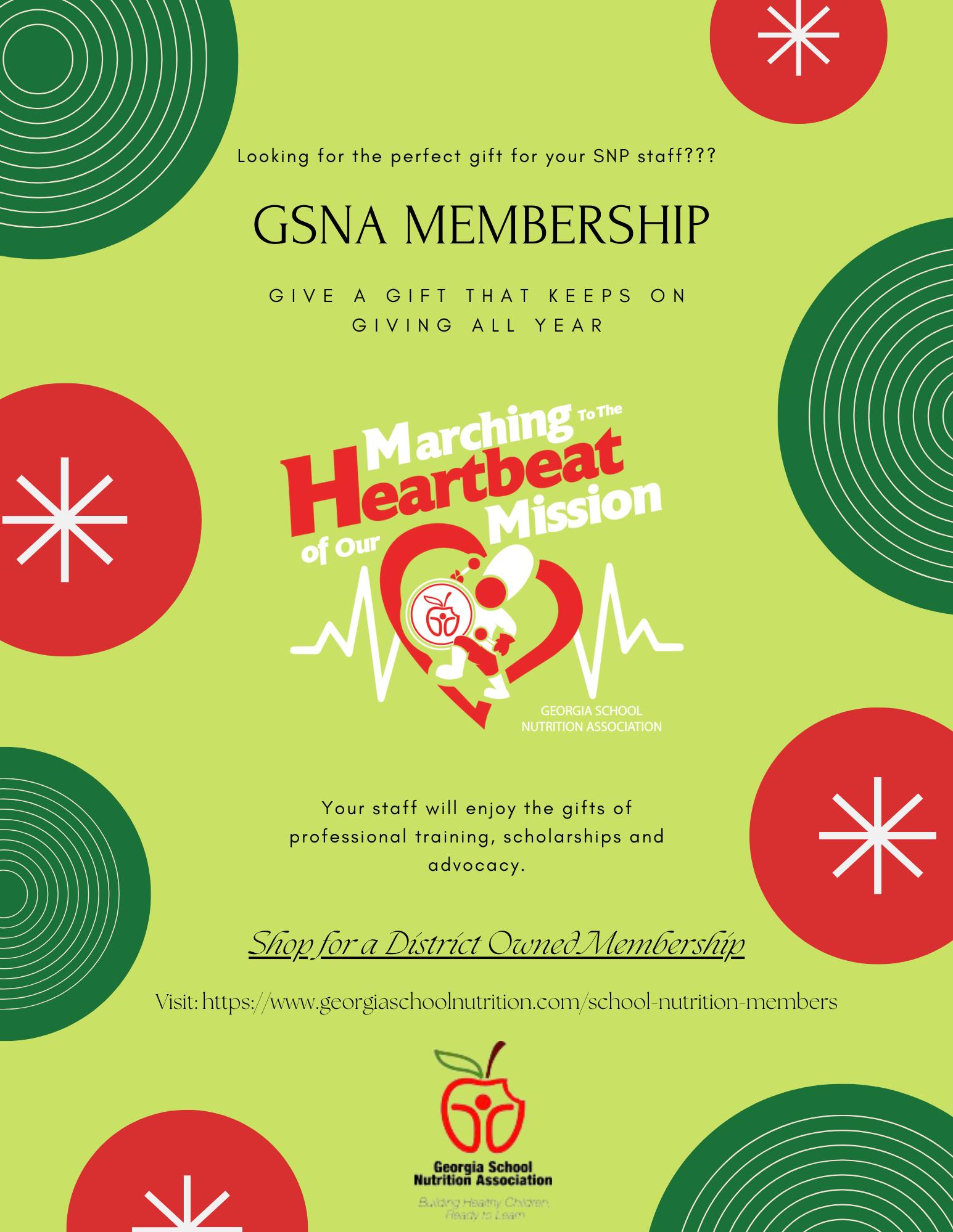 Take a moment and visit the Georgia School Nutrition Association website at georgiaschoolnutrition.com and take a peek under the GSNA Christmas tree for gift ideas from RADA Cutlery, a fundraiser supporting the Georgia School Nutrition Foundation scholarship fund. Additionally, you can find GSNA t shirts and sweatshirts while supplies last to give to your friends that will always remind them to never stop Marching to the Heartbeat of Our Mission. Also, look for the membership forms for District owned membership as well as individual membership. No one will return the gift of membership to the best and most recognized professional organization in the country!