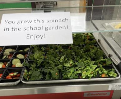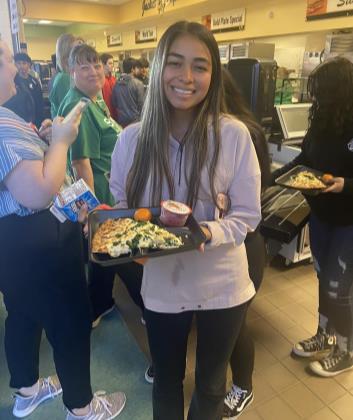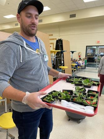 up to serve chicken & spinach pizza and spinach salad to the high school students.