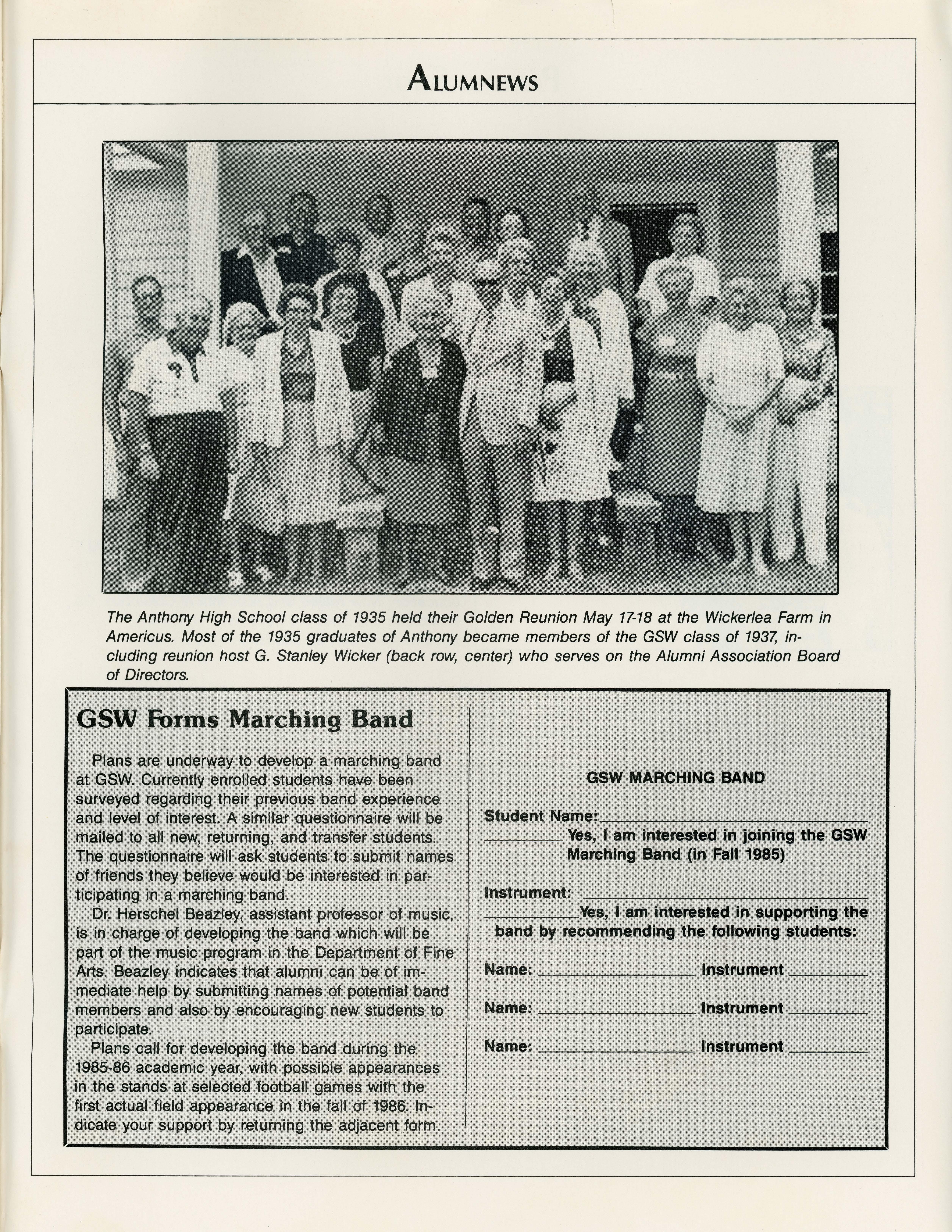 Plans call for developing the band during the 1985-86 academic year, witn possible appeara11ces in the stands at selected >fo~tbaU game~ with t He first actual field appearance in.the fall..ofJ986. dicate your support by returning the adjacent