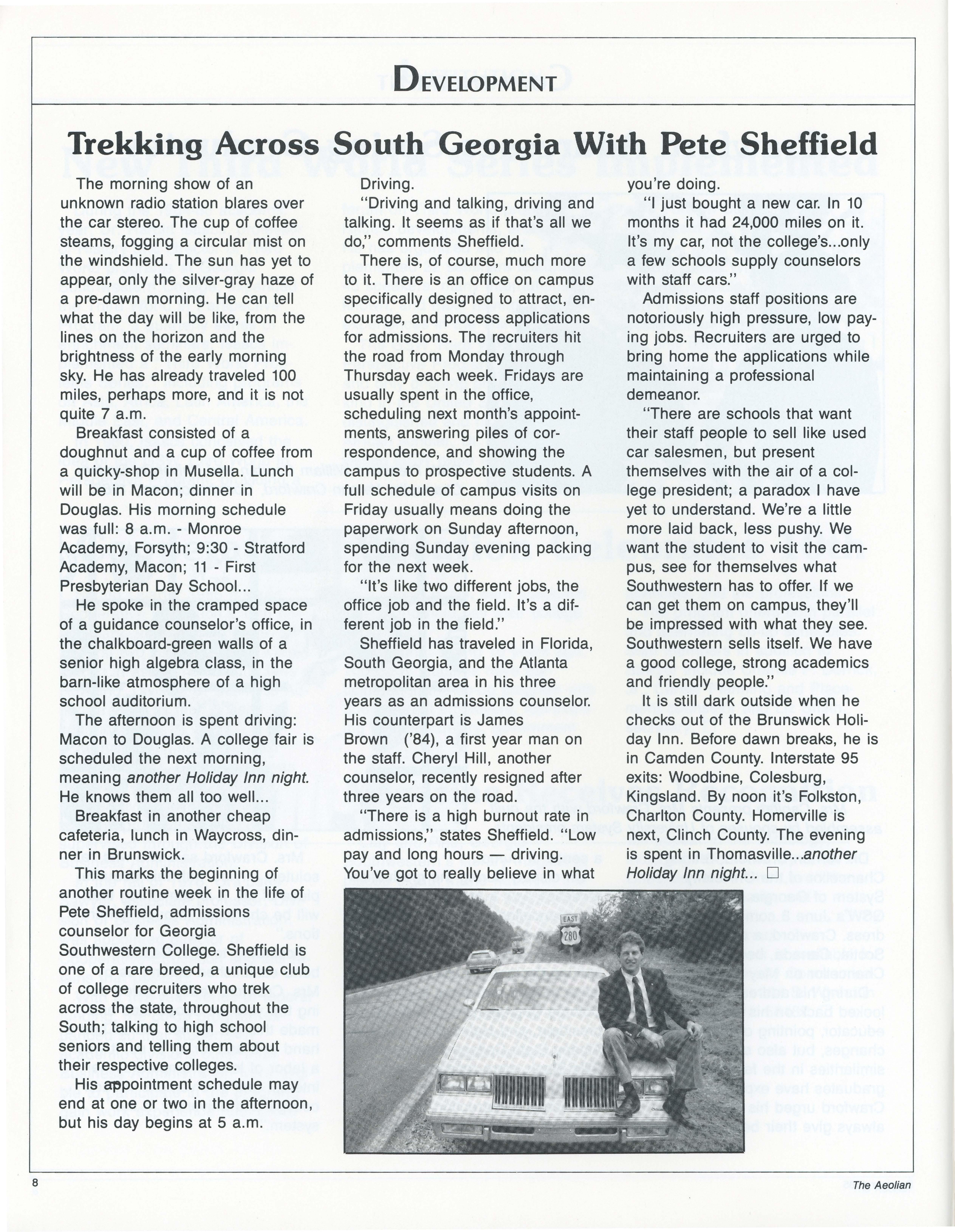 This marks the beginning of another routine week in the life of Pete Sheffield, admissions counselor for Georgia Southwestern College. Sheffield is one of a rare breed, a unique club of college recruiters who trek across the state, throughout the South; talking to high school seniors and telling them about their respective colleges.