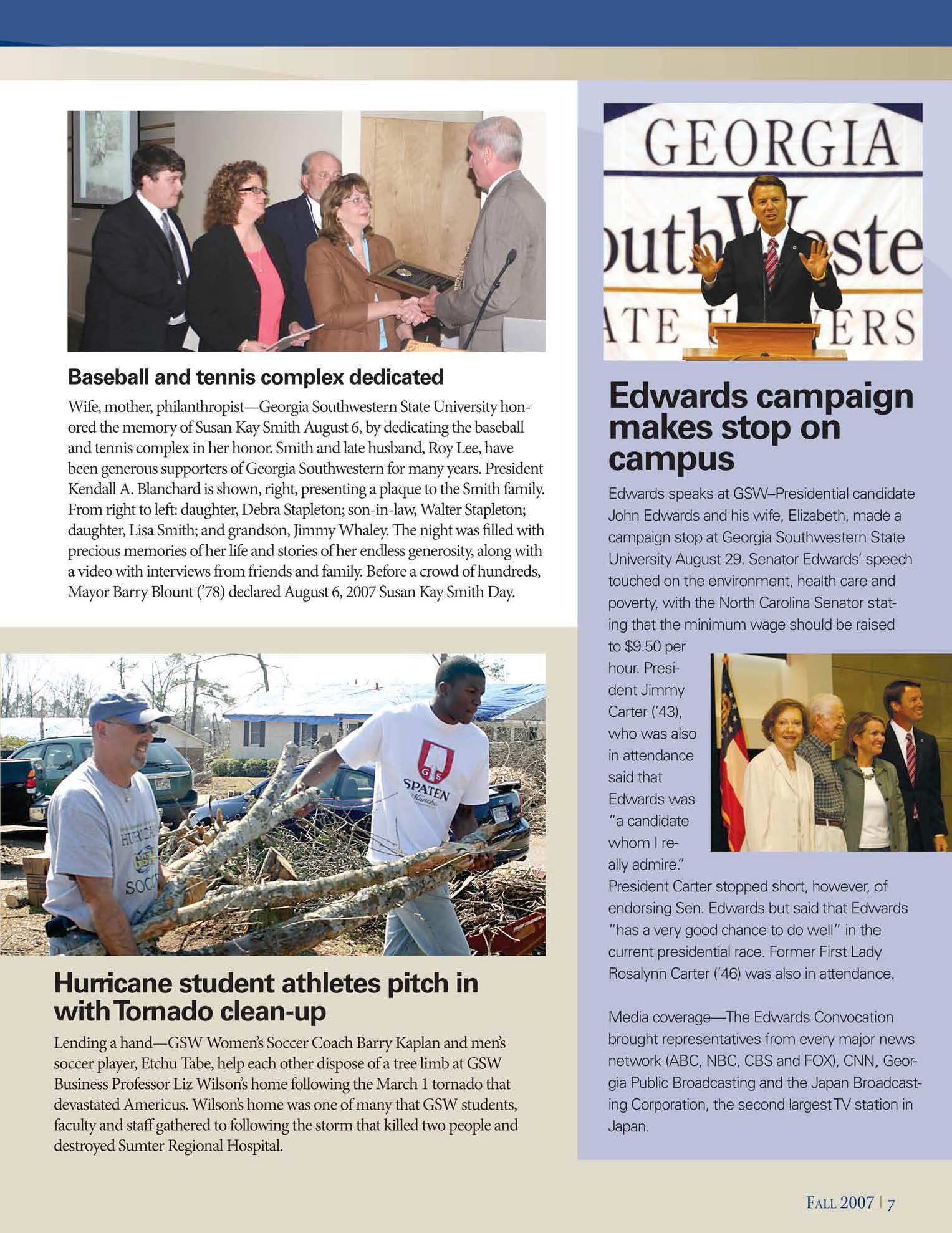 Edwards speaks at GSW-Presidential candidate John Edwards and his wife, Elizabeth, made a campaign stop at Georgia Southwestern State University August 29. Senator Edwards' speech touched on the environment, health care and poverty, with the North Carolina Senator st ating that the minimum wage should be raised to $9.50 per hour. President Jimmy Carter('43), who was also in attendance said that Edwards was "a candidate whom I really admire:·