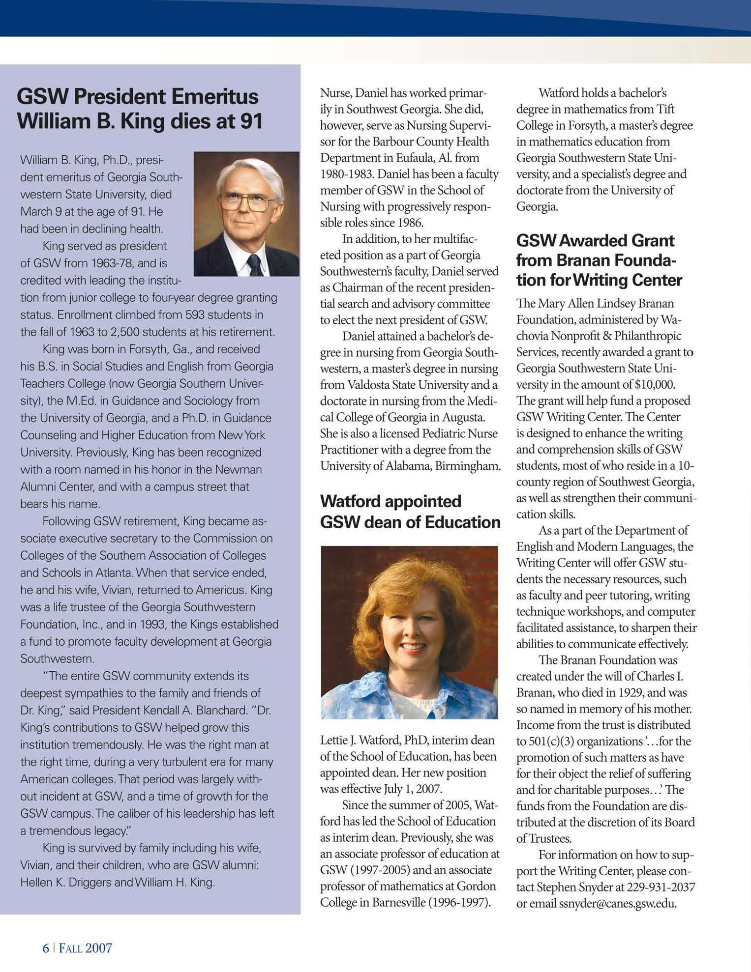 Originally from Blakely, King joined the staff of Georgia Southwestern as director of Accounting Services in l 996 before serving as comptroller from 2000-2007.
