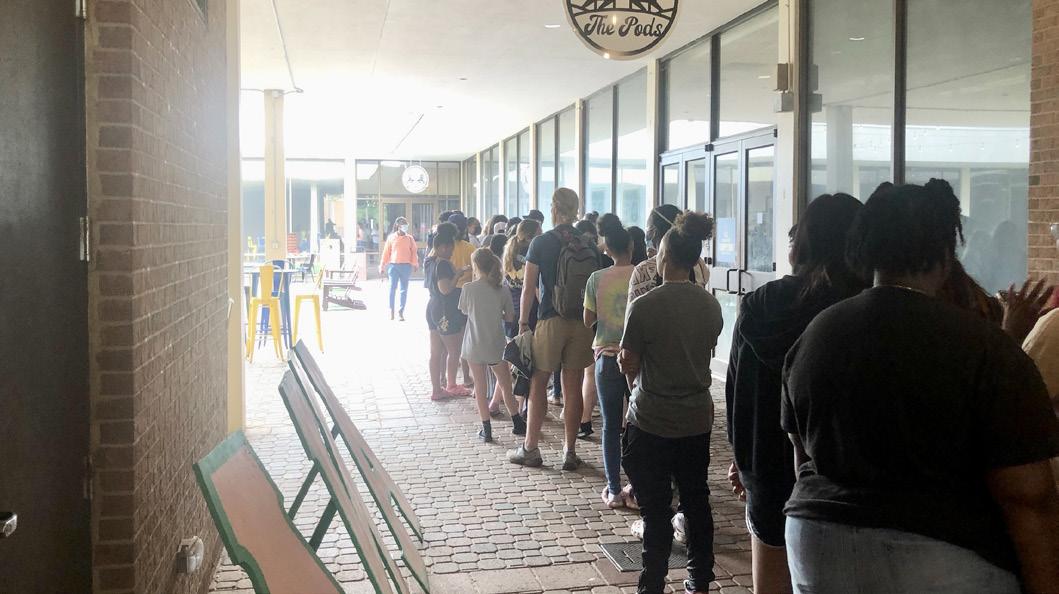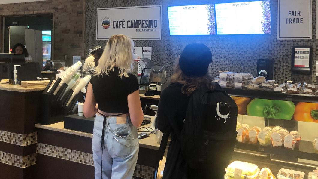 Students lined up to get their free drink from Café Campesino. Students lined up to receive their free t-shirts.