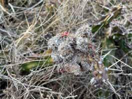 With only six months of data so far, it is too early to draw conclusions on how the monitoring sites are responding to the mealybug. Initial impressions suggest the height of mealybug-infested plants have reduced, even with low insect numbers being present. There is clear evidence of distorted growth tips and damaged fruit, including some dead cladodes and plants (Figure 3 - Close-up of mealy bug numbers and beginning of tip distortion on Harrisia cactus. The yellow blotches are a type of scale insect and the white dots at the end of a stalk are lacewing eggs.).