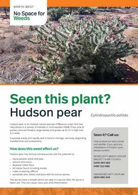 12 | CACTUS QUARTERLY How invasive is your cactus? Resources to download Hardcopies are available from Northern Slopes Landcare Bingara cacti@nsla.net.au Check out our videos at Northern Slopes Landcare The playlist includes videos on: • what is Hudson pear • what cochineal look like; • where to collect cochineal; • how to collect, transport and collect cladodes; • how to release cochineal and • further integrated control option. Visit: northernslopeslandcare.com.au/cacti/cacti-news-media/ cactus-news They are also available on a handy, credit card sized data stick, available at various locations around Lightning Ridge, Grawin and Cumborah or email weeds@dpi.nsw.gov.au Hudson pear (Cylindropuntia pallida) Playlist