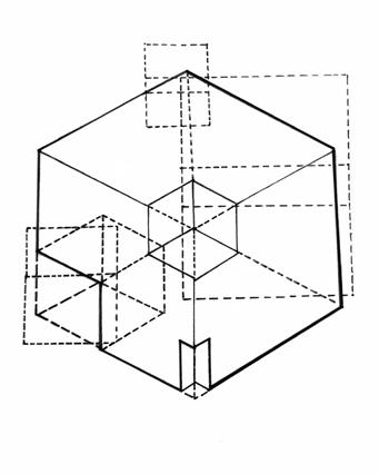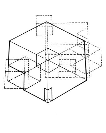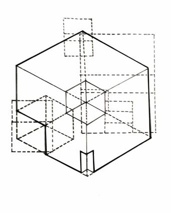 The next variation is from the combination of the 4-fold and 6-fold patterns. Two main ways used here is the projecting and subtracting. From the front to the back, each layer is become lesser and lesser by subtracting from elements from the previous one. The first layer is constructed by changing the order of the patterns, applying a new spatial order.