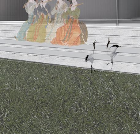 The sequence of the layout from left to right (west to east) is from private to public to private. Meditation area, the most private and quite space, is set away from the river and noisy space. Surrounded by the nature, the meditation area has two topics, transparency and blurry. The first floor is surrounded by the transparent windows, which help to bring the outside nature into the interior space. The next floor is surrounded by frosted glass, presenting the surrounding scenery to visitors with a hazy feeling, like an oil painting, like a dream.