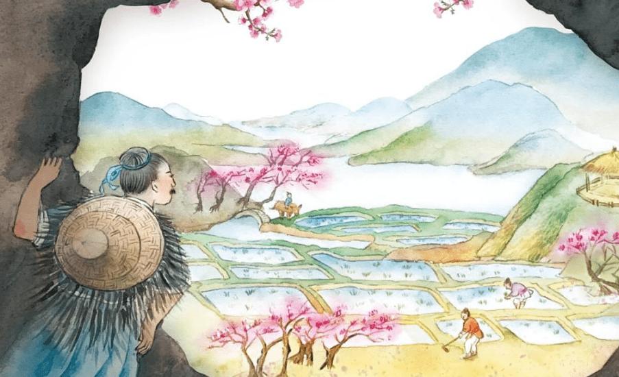 The man abandoned his boat and entered the opening. It was narrow at first, just enough to pass through. After several tens of steps, the way led to vast spaciousness. The land was level and expanded, houses were spread out in good order; goodly farms, fair ponds and mulberry and bamboo thickets were to be seen everywhere.