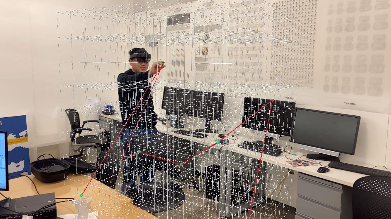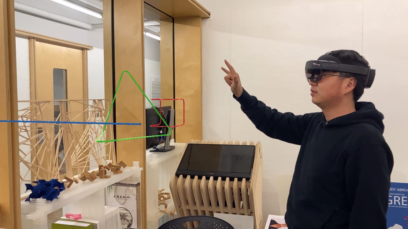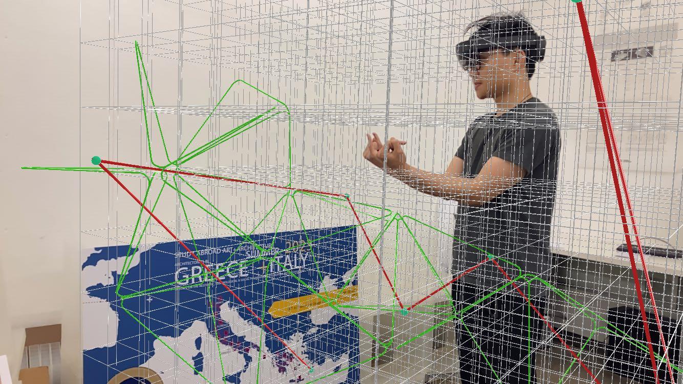 For this project, we developed a user-friendly mixed reality design system by using grasshopper and c#. By using a system, the user first need to adjust a 3D grid in the space. Then, the user need to pick a basic geometry by using the different gestures. Then the user needs to define a curve or a polyline on the grid by using the Draw Definition. The basic geometry will start to “grow” following the polyline drawn by the user, by using the aggregation process based on the discrete design logic. The process will generate a sculpture-like project around the user. The last step is for the user to adjust the amount of the basic geometries generated by the process, the density of the geometries. The generation logic is based on the WASP toolkit, a Grasshopper plug-in. The description of each part includes all information necessary for the aggregation process (part geometry, connections location and orientation).