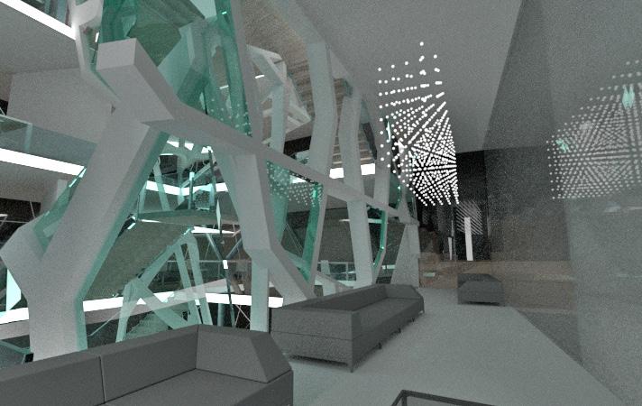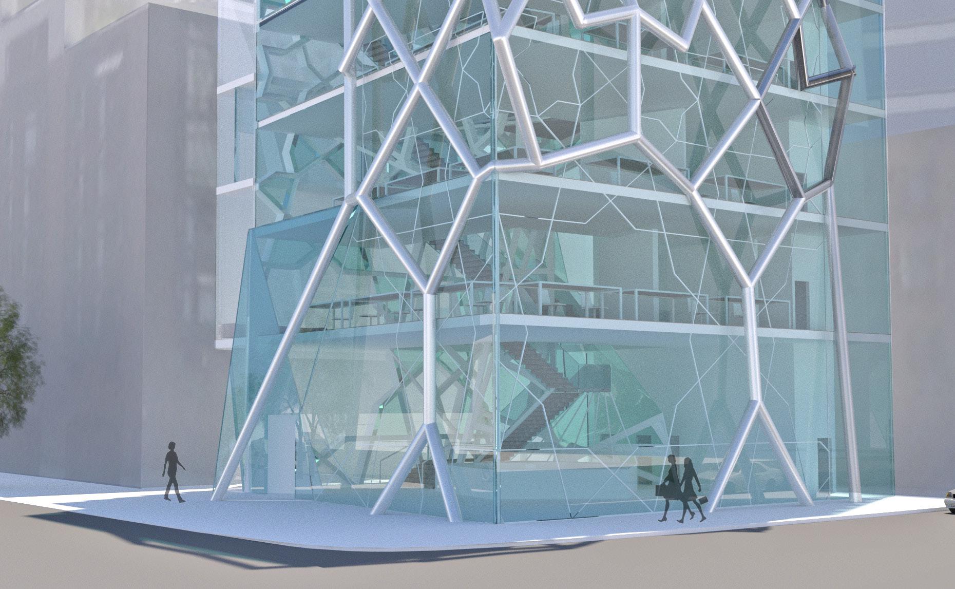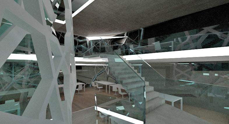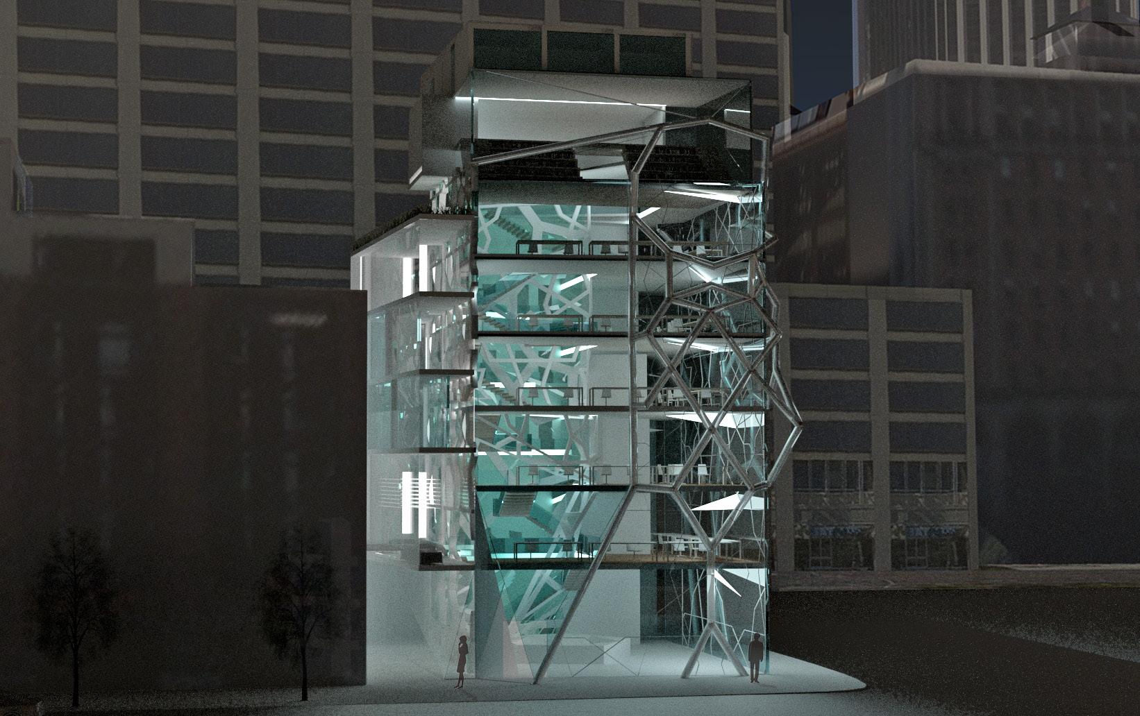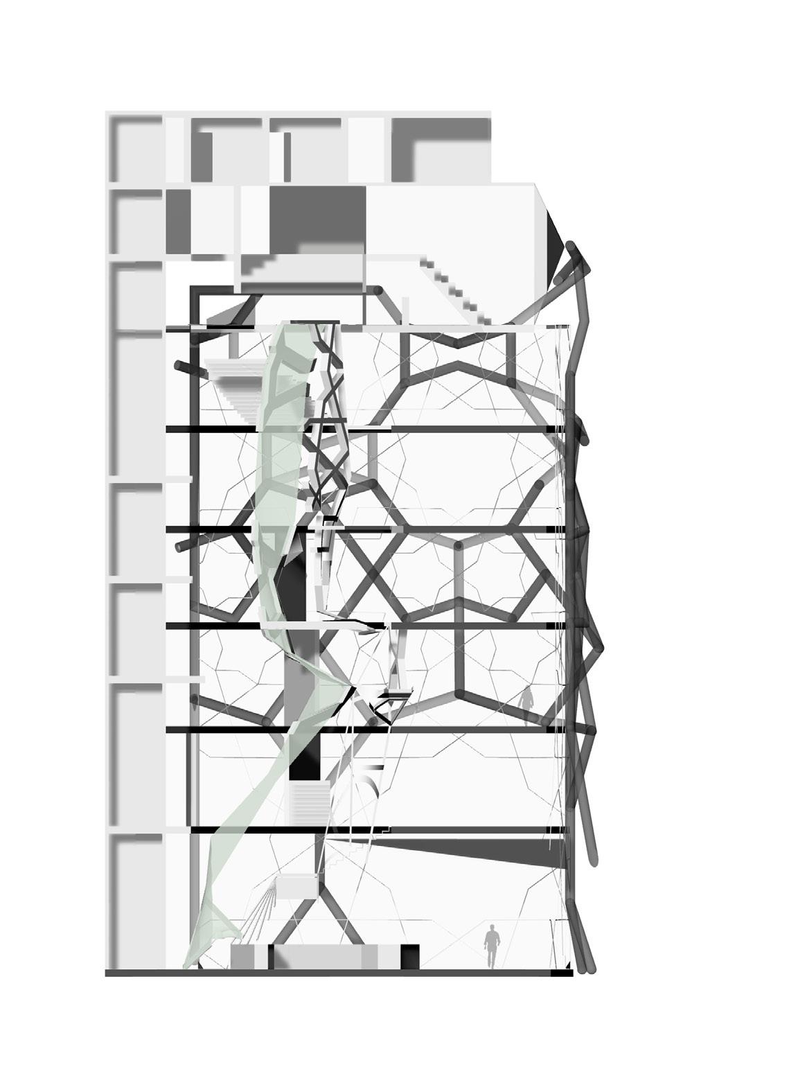The skin is composed by two layers. Inside is the glass and outside is the polycarbonate panel. The half transparency of the polycarbonate material shows the movement of the people inside and the interior space to the outside in an implicit way, as a advertisement of the project to the public.
