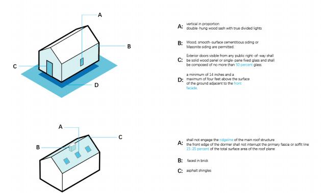 From the beginning is the general regulations, certificates of appropriateness required above shall be obtained from the commission or the director, as applicable, in accordance with the regulations. About the design standards, all new construction shall be one of the house styles of a contributing building that appears on the block face of the street on which the new construction shall occur. The design principles include specific standards of the different parts of the buildings, including facades, roofs, dormers, porches, site development, sidewalks and curbs. Moreover, there are other regulations about the accessory structures and uses, grading and landscaping, fences, walls, etc.