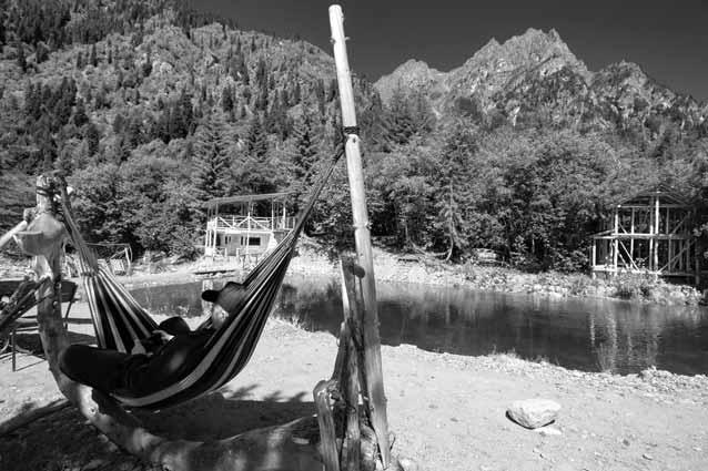 The Inn includes what you would expect: a shop and cafe offering hot and cold food and drinks. But there is so much more. A sauna! A dammed swimming pool and, below it, a trout pool where you can catch your lunch! Hammocks and deckchairs everywhere! Even a diving platform. True, I got into the pool to ankle depth and lost the feeling in my feet from the coldness of the water,