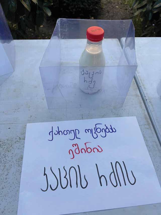 The “Male Milk” Controversy: One of the most surreal elements of the exhibition references Georgian oligarch and former Prime Minister Bidzina Ivanishvili’s assertion that “in the West, male milk is equated with female milk.” This bizarre statement, which sparked ridicule across social media, epitomizes the anti-Western rhetoric employed by the ruling party. The students’ inclusion of this reference underscores the absurdity of such moral panics, framing them as distractions from real issues like economic stagnation and democratic backsliding.