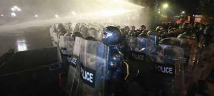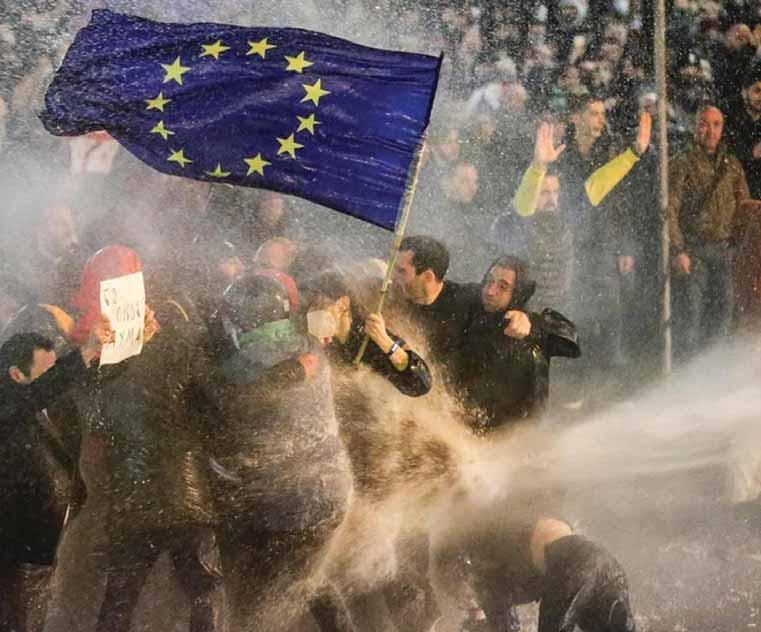ag are sprayed with a water cannon during clashes with riot police near the Georgian parliament in Tbilisi. Source: AFP