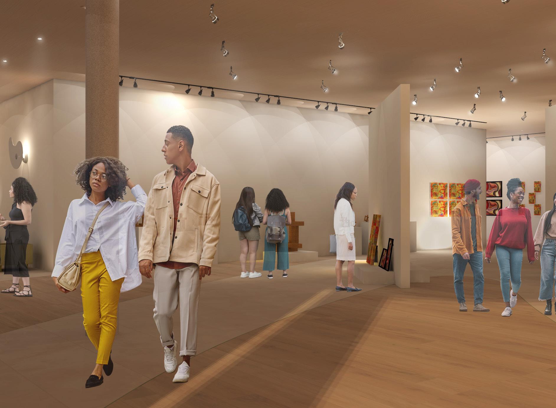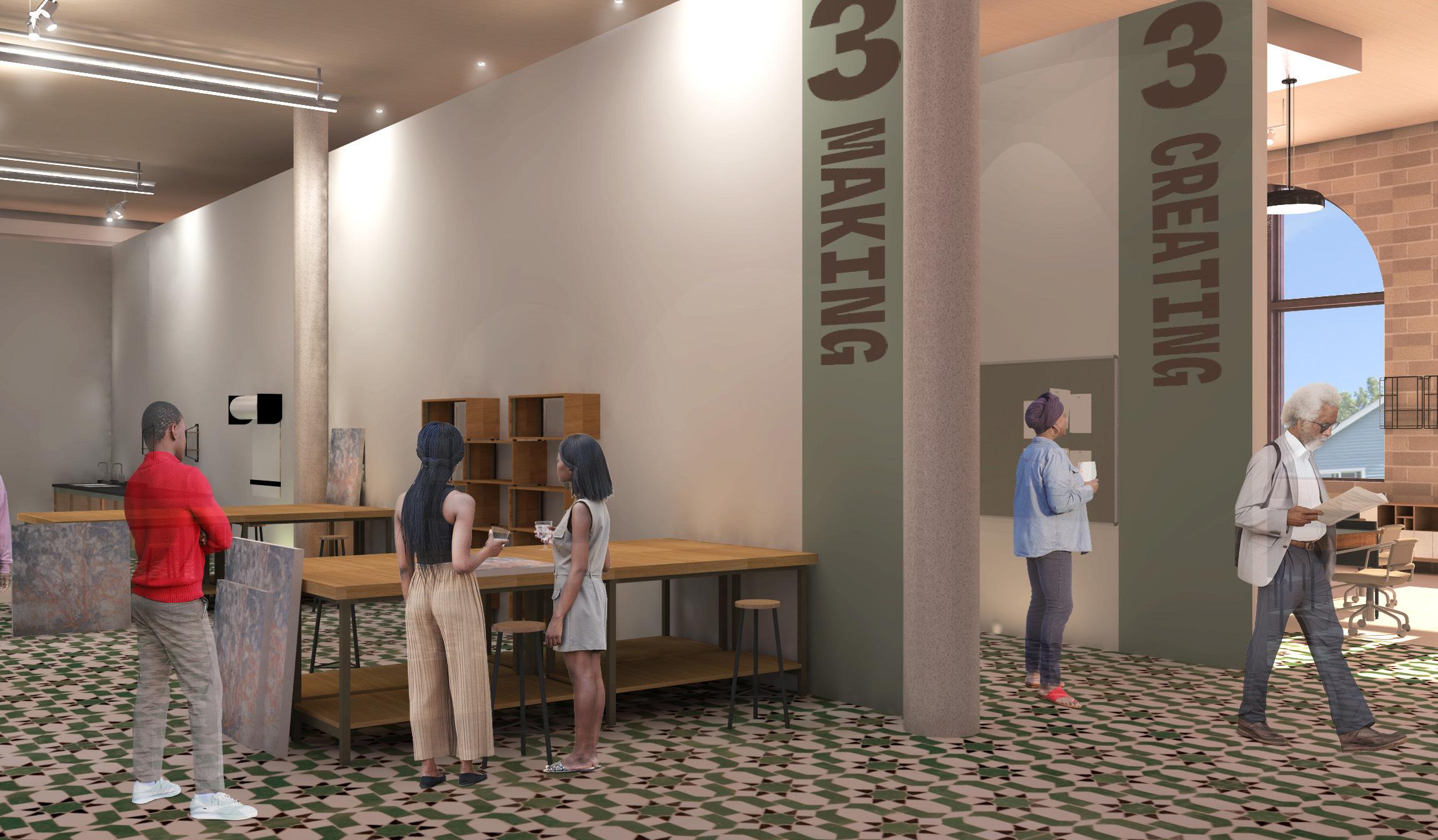 Further playing with composition, the space contains a mix of open spaces to allow for visible engagement throughout the building as well as tucked away, private spaces for offices and some artist studios. In that sense, the floors differ in heights to highlight certain aspects of the spaces they hold. For example, the ART SHOWING floor has higher ceilings to allow for taller pieces of work to be showcased as well as provide a different feel on each floor.
