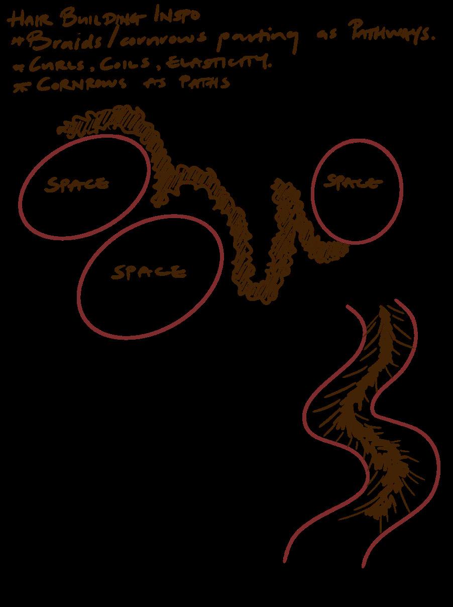 The movement and flow within the building takes inspiration from cornrows, a method of hairstyling that is in some ways foundational for other hairstyles for Black hair. Cornrows are style of hair braiding that involves the skillful braiding of coily and textured hair close to the scalp which involves an intricate general braiding pattern. In the 60s, with the resurgence of the ‘Black is Beautiful’ movement’, cornrows saw a resurgence and public favor as Black people were finding beauty and community in themselves, this was heavily expressed in one’s hair. The intricate braiding technique serves as a protective hairstyle and is nostalgic for a lot of Black people as it is a common hairstyling technique for young children. Borrowing the motifing, following an intricate patterning, exploring different paths one can take with their hair but maintaining clean, geometry, this is an example of passive art displayed by Black people. Just as it is also a finished hairstyle, it is also a common foundation for other hairstyles. Aiming to emulate this, the ARTIST’S SALON’s floor plans borrow from their soft curves, aiming to play with angles and moving the human form on a journey throughout spaces.
